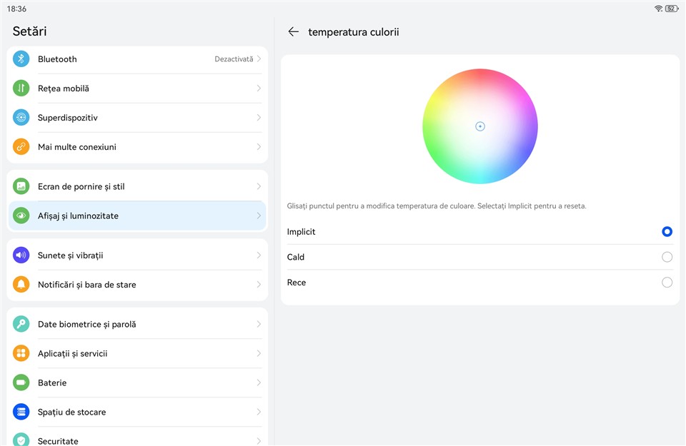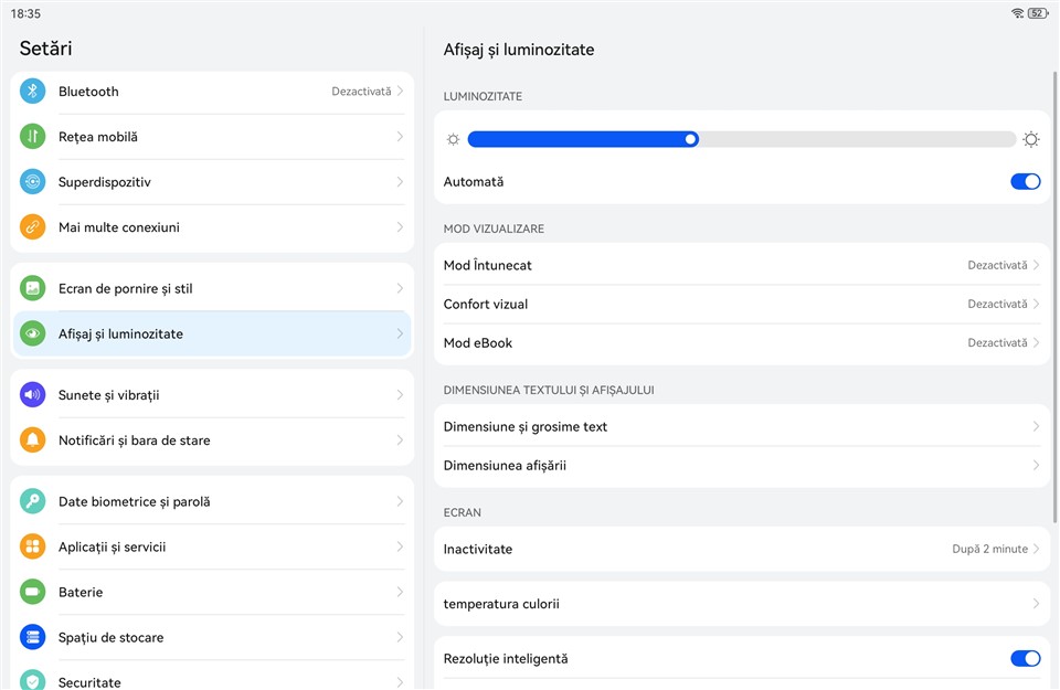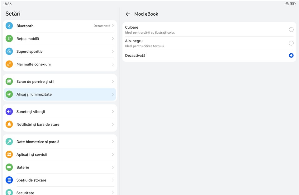 Nu pot și nu vreau să uit de posibilitatea de a activa modul eBook, care poate fi ales în format color sau alb negru, în ambele cazuri ideal pentru a citi ore bune pe Huawei MatePad 11.5 2025 PaperMatte Edition.