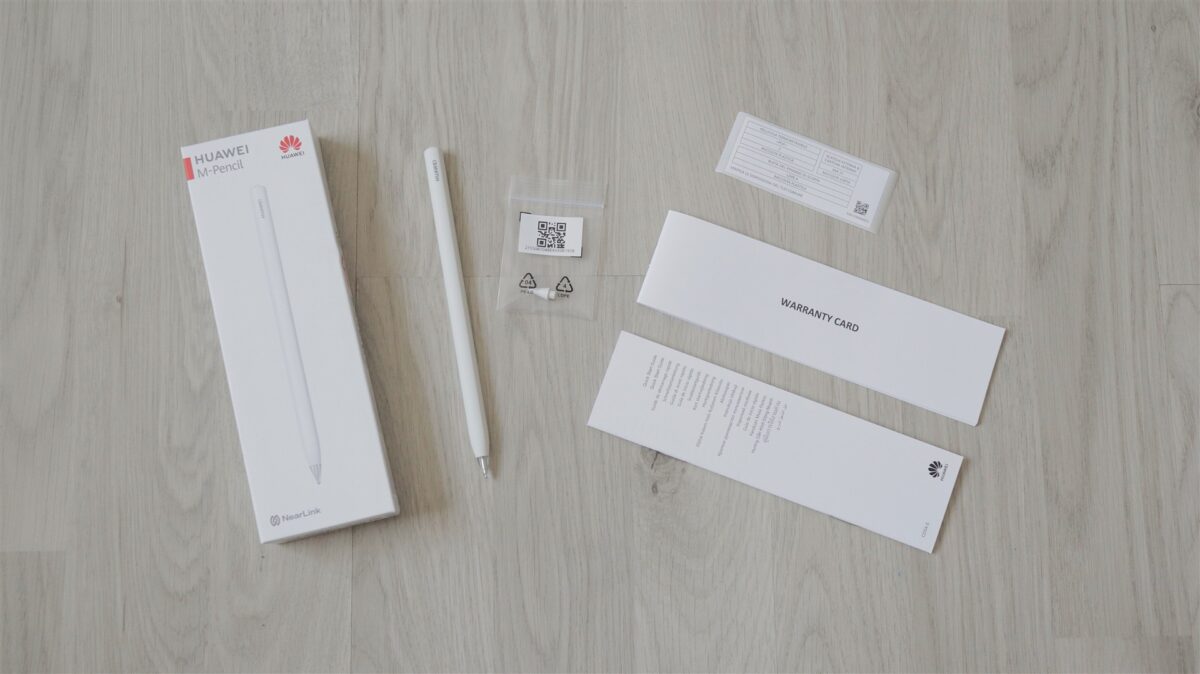 Stylus-ul Huawei M-Pencil 3rd gen vine cu un capăt de rezervă în cutie, alături de câteva mici pliante.