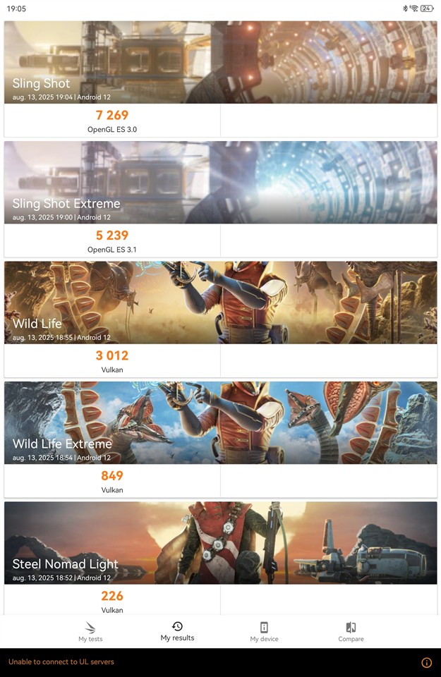 | 3DMark Sling Shot (OpenGL ES 3.0) Sling Shot Extreme (OpenGL ES 3.1) Wild Life (Vulkan) Wild Life Extreme (Vulkan) Steel Nomad Light (Vulkan) | 7269 puncte 5239 puncte 3012 puncte 849 puncte 226 puncte |