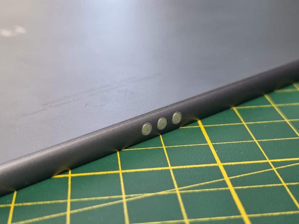 În lateral stânga se află un port magnetic pentru conectarea cu tastatura bluetooth ce are și rol de husă de protecție.