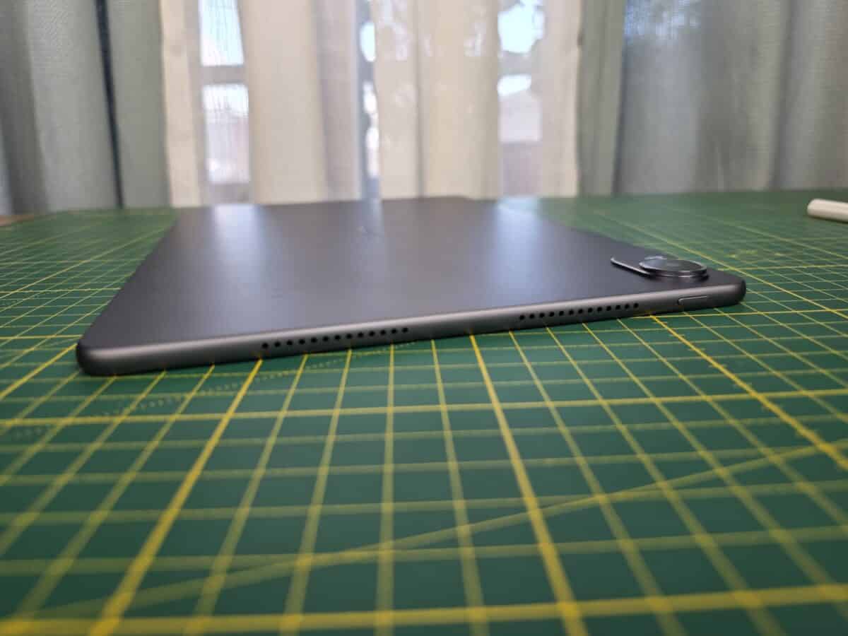 Cu tableta în mod portrait, în partea superioară dați de două difuzoare și butonul de pornire, pe lateral dreapta se află reglarea volumului și aici antamați stylys-ul la încărcat, la bază au adus un port USB Type-C 3.1 și alte două difuzoare.