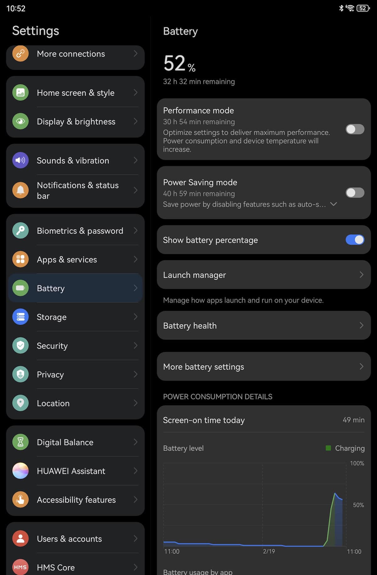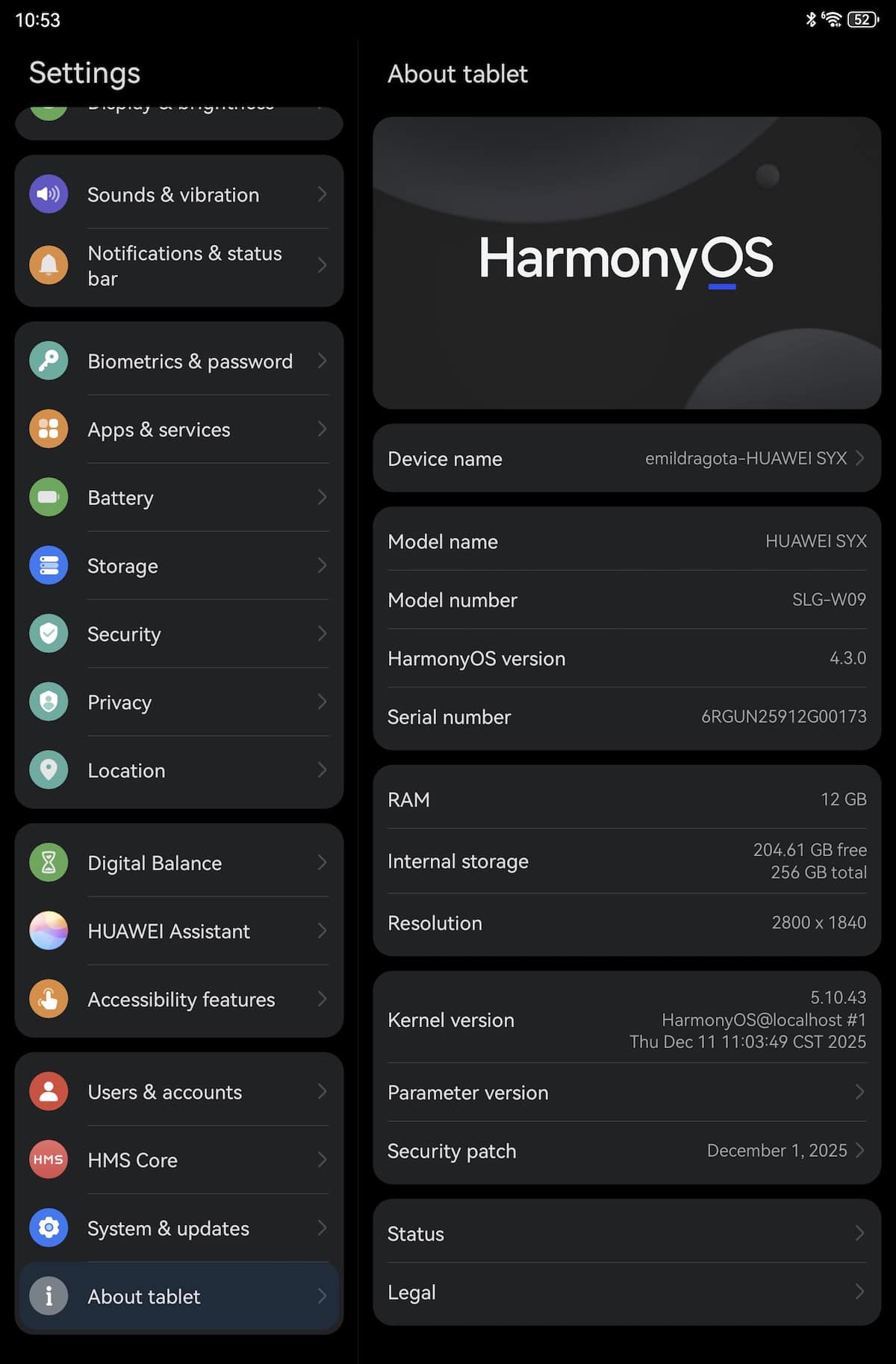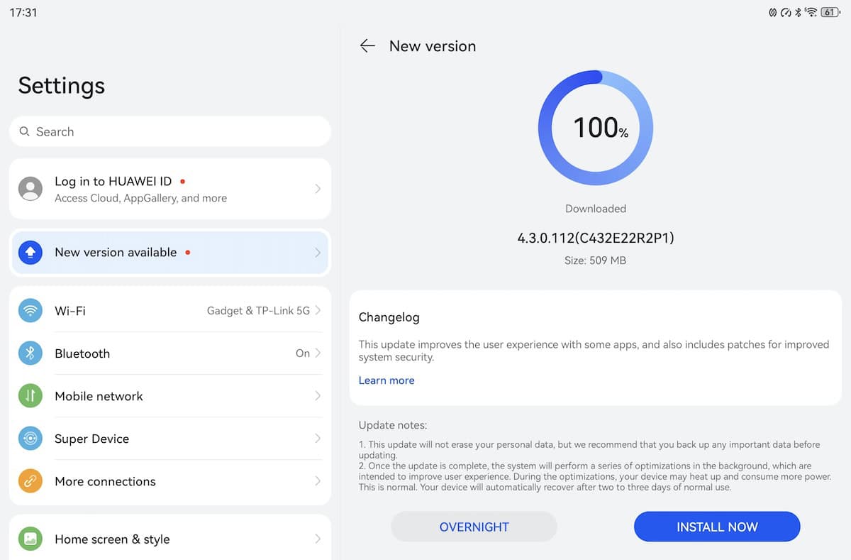Rulează Harmony OS, software dezvoltat intern de către Huawei. La pornire a primit un update de peste 500 MB.