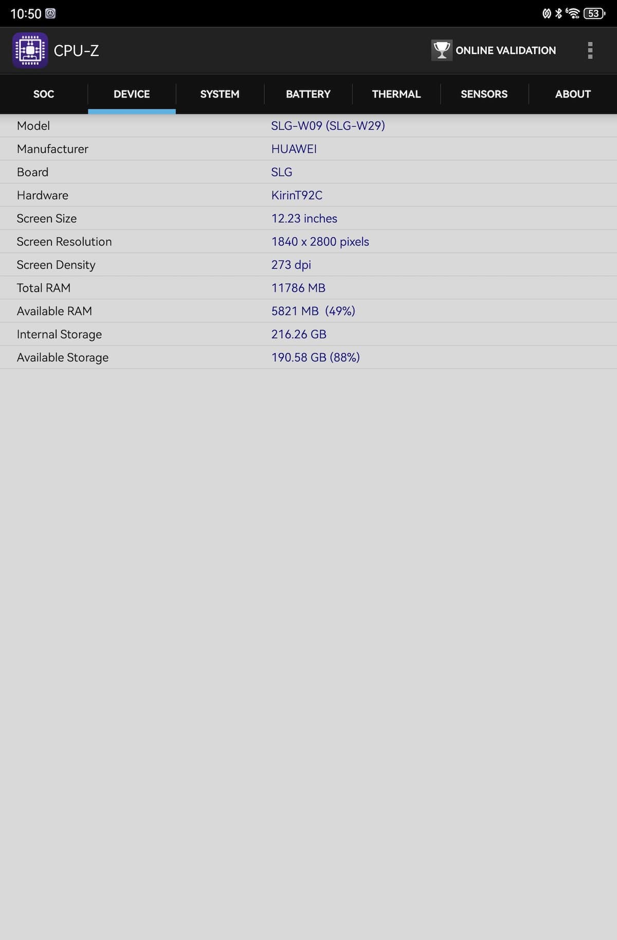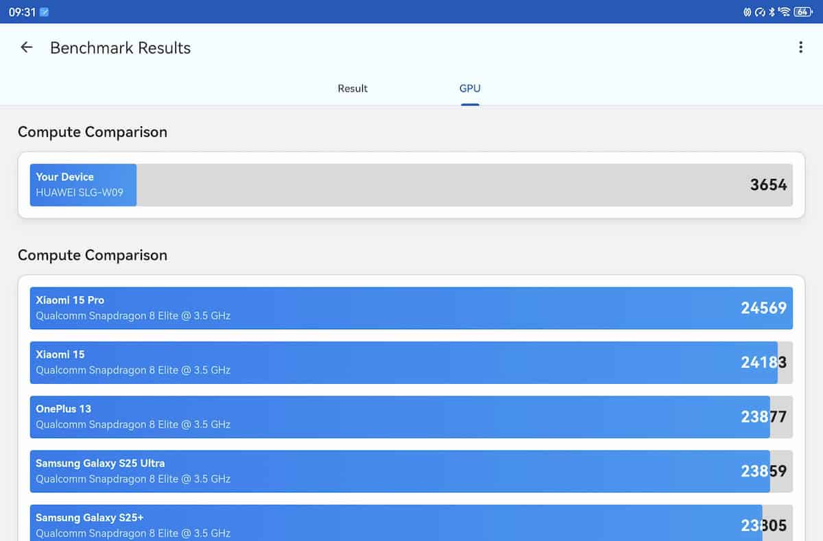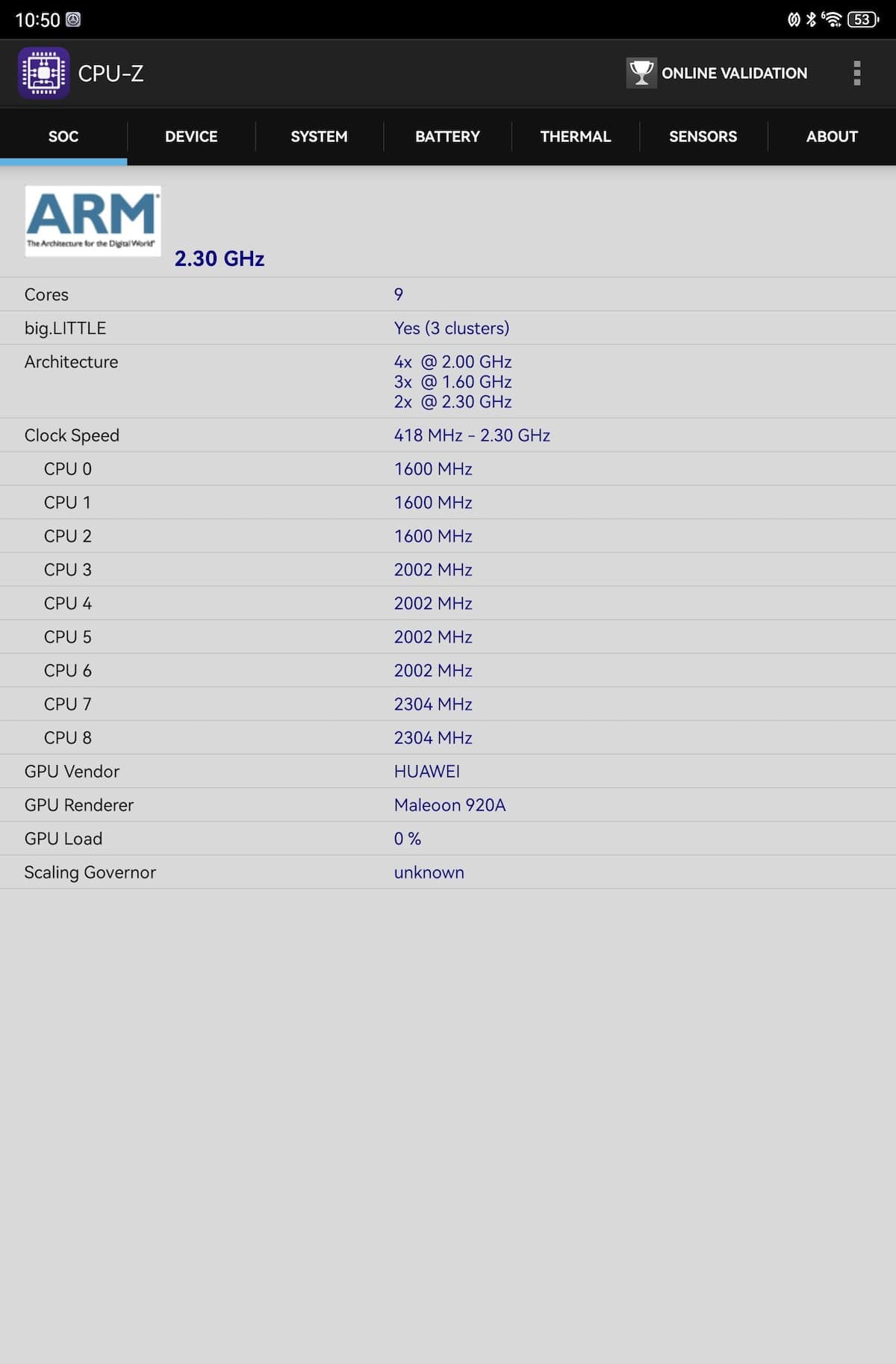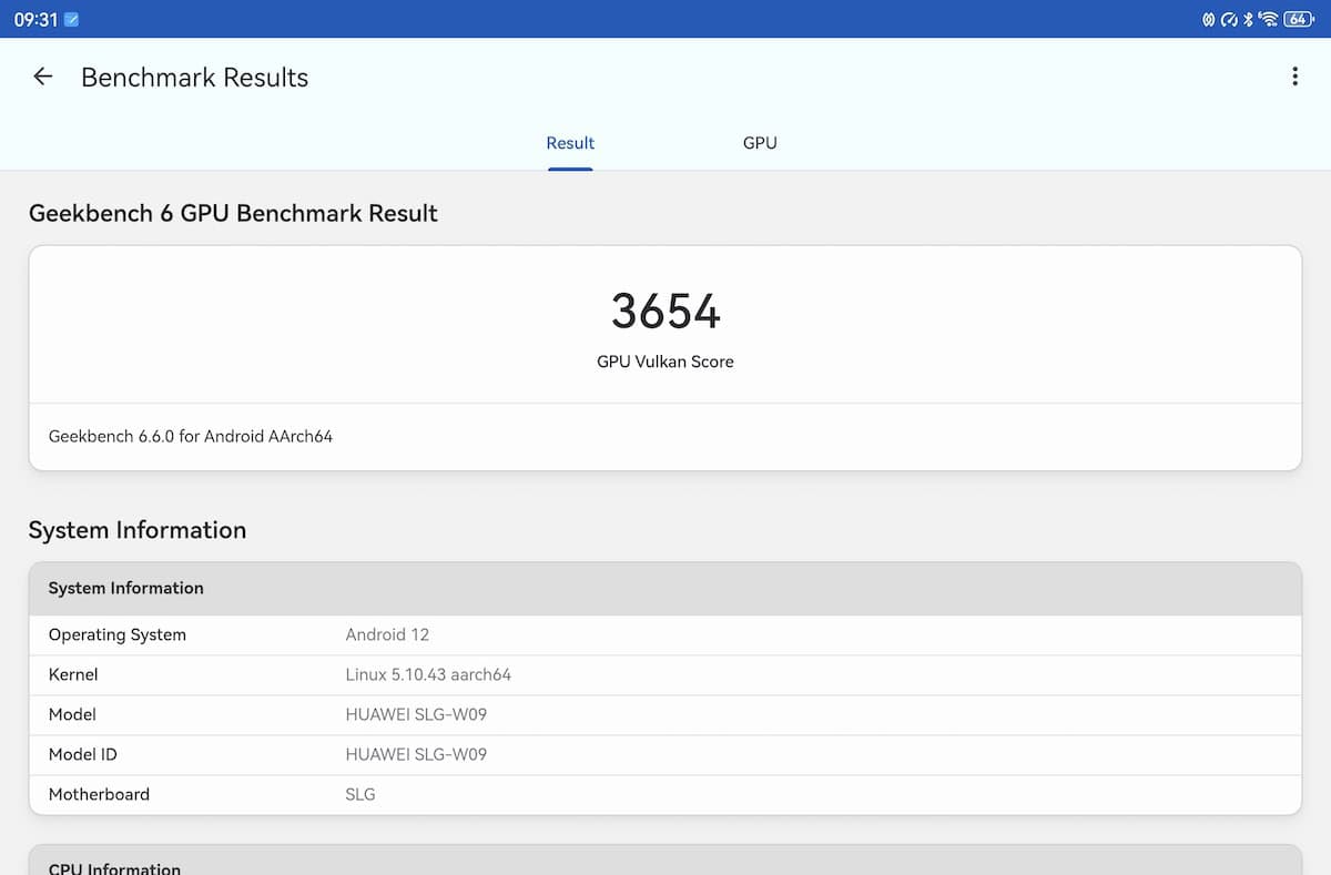 CPU-Z relevă o structură tri-cluster: 2 x 2.3 GHz, 4 x 2.0 GHz și 3 x 1.6 GHz, iar Maleoon 920A este în rol de GPU. Pe site-ul Huawei se specifică un chipset cu 6 nuclee, aspect confirmat și de către Geekebench 6 – 1 x 2.3 GHz, 2 x 2.0 GHz și 3 x 1.6 GHz. Înclin să cred că GeekBench 6 are dreptate la nivel de hardware.