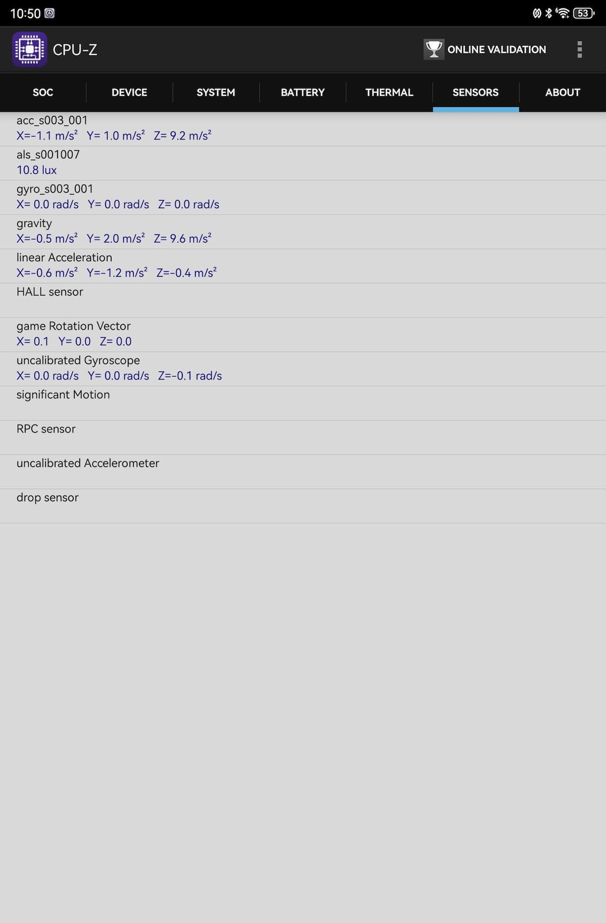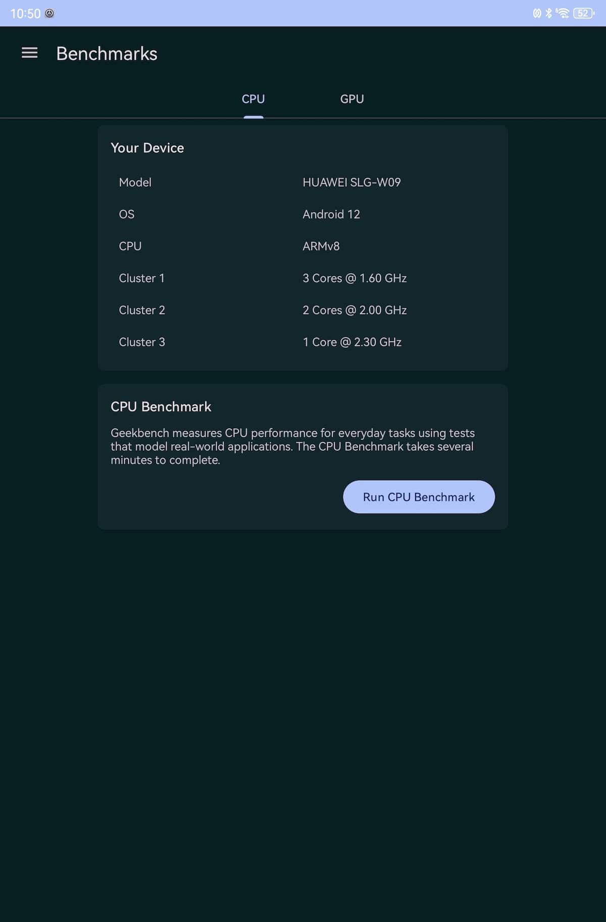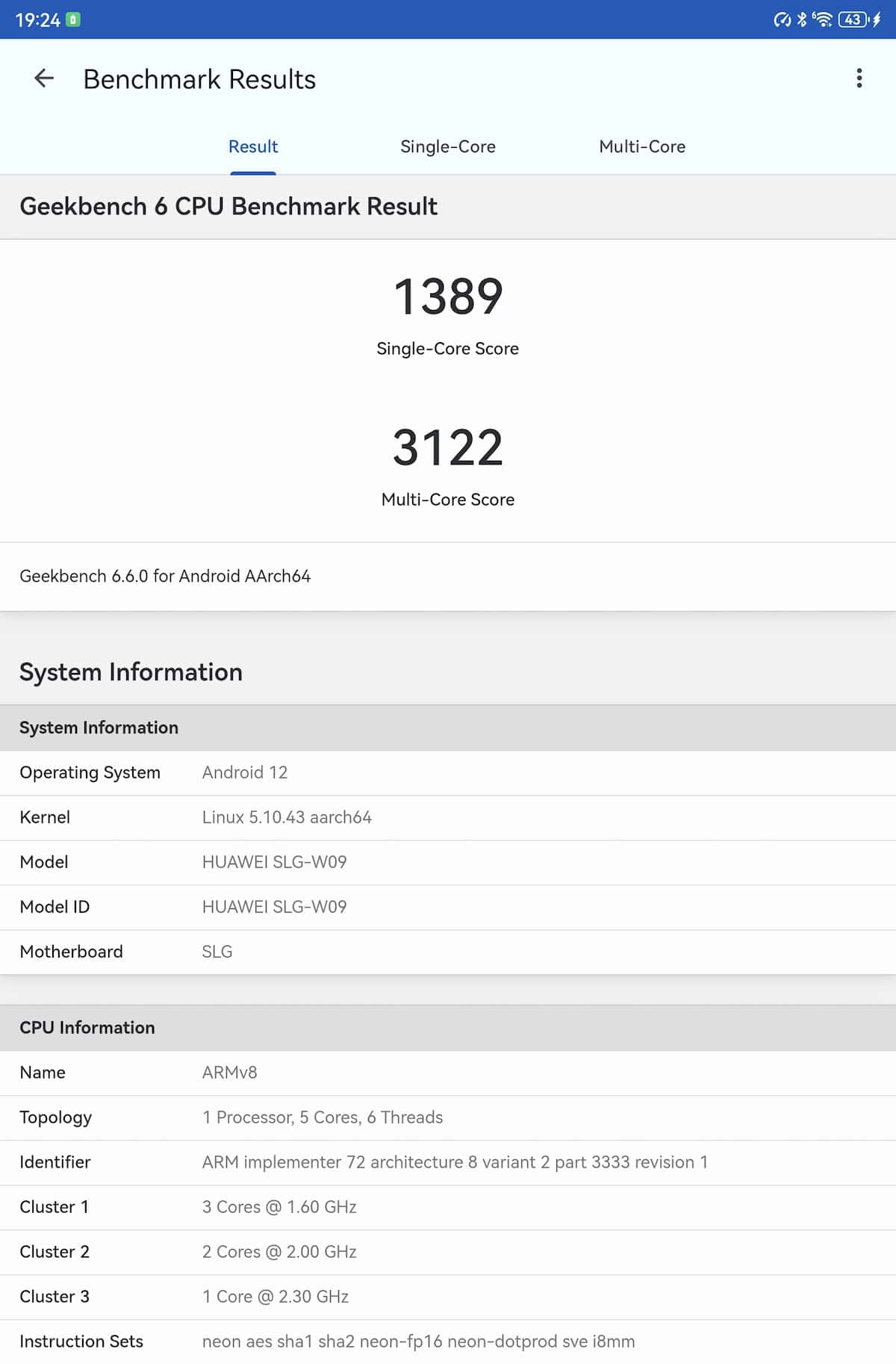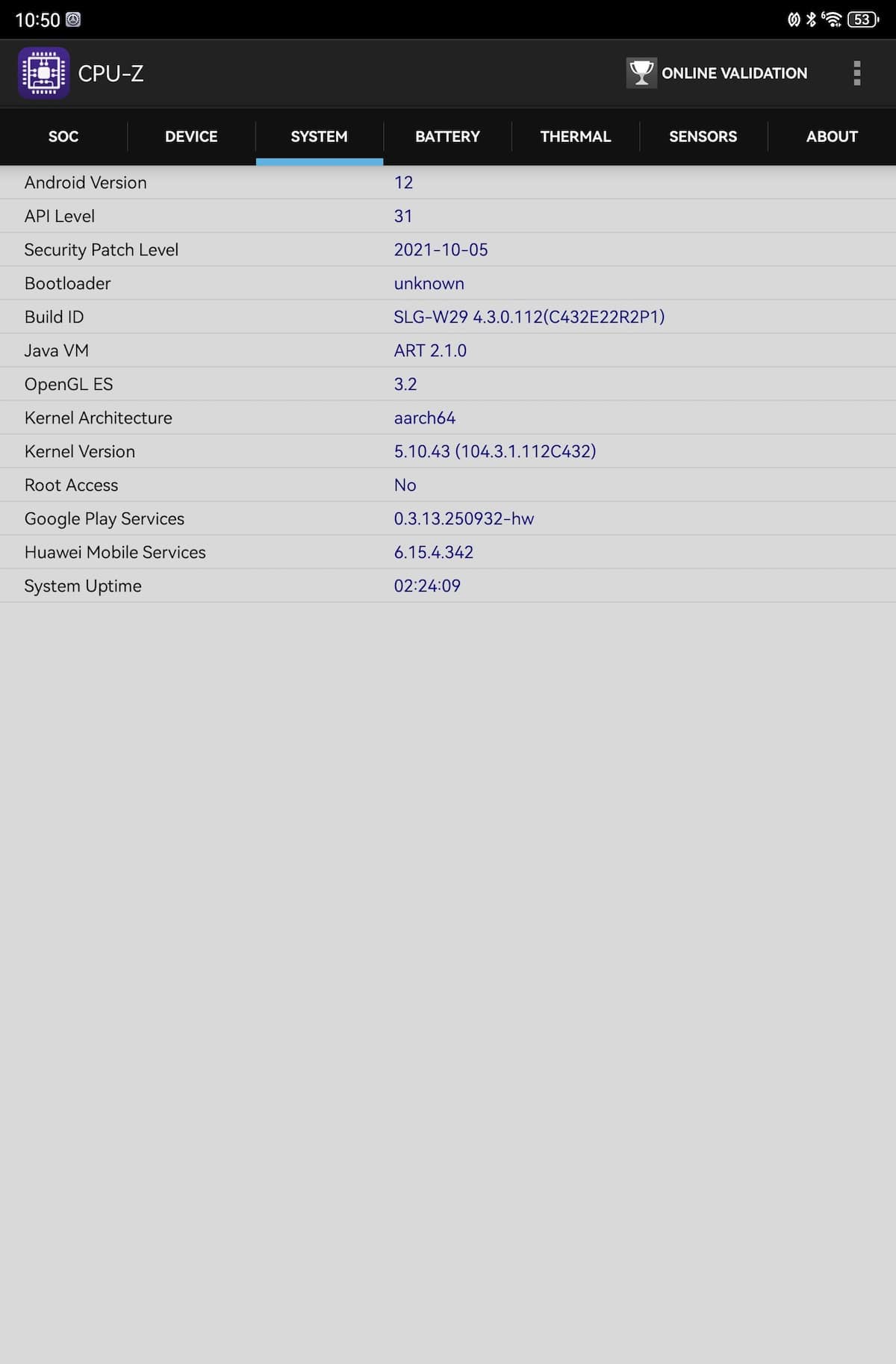 CPU-Z relevă o structură tri-cluster: 2 x 2.3 GHz, 4 x 2.0 GHz și 3 x 1.6 GHz, iar Maleoon 920A este în rol de GPU. Pe site-ul Huawei se specifică un chipset cu 6 nuclee, aspect confirmat și de către Geekebench 6 – 1 x 2.3 GHz, 2 x 2.0 GHz și 3 x 1.6 GHz. Înclin să cred că GeekBench 6 are dreptate la nivel de hardware.