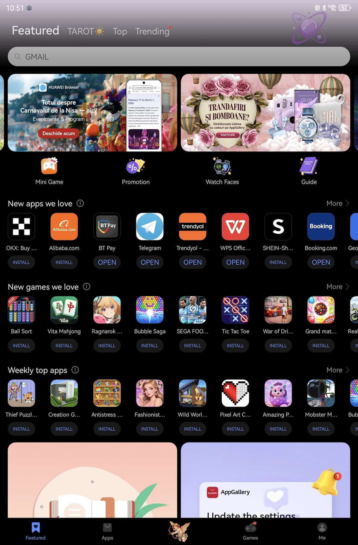 Ai YouTube, Gmail, Chrome și orice aplicație îți dorești. Pentru AnTuTu nu a trebuit să intru pe website-ul lor, l-am găsit direct în AppGallery.