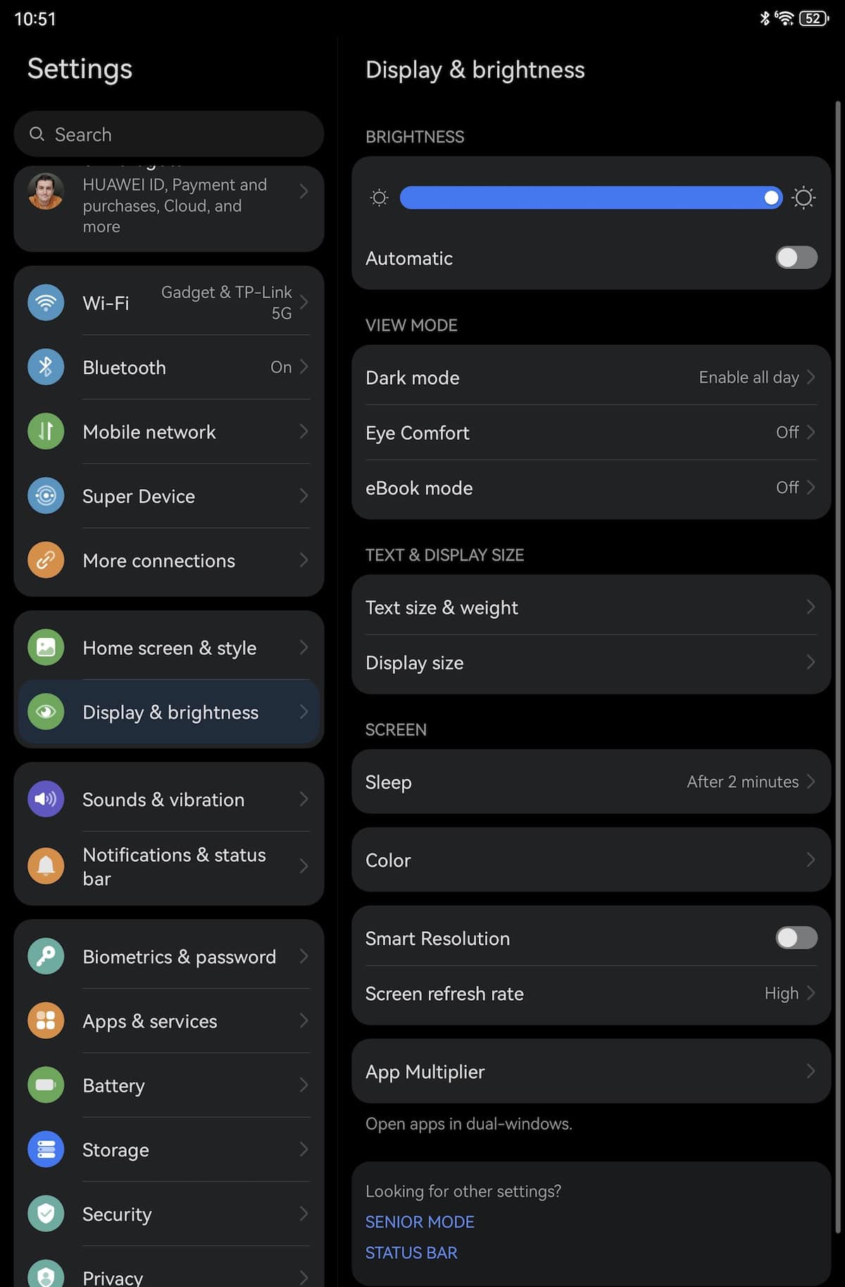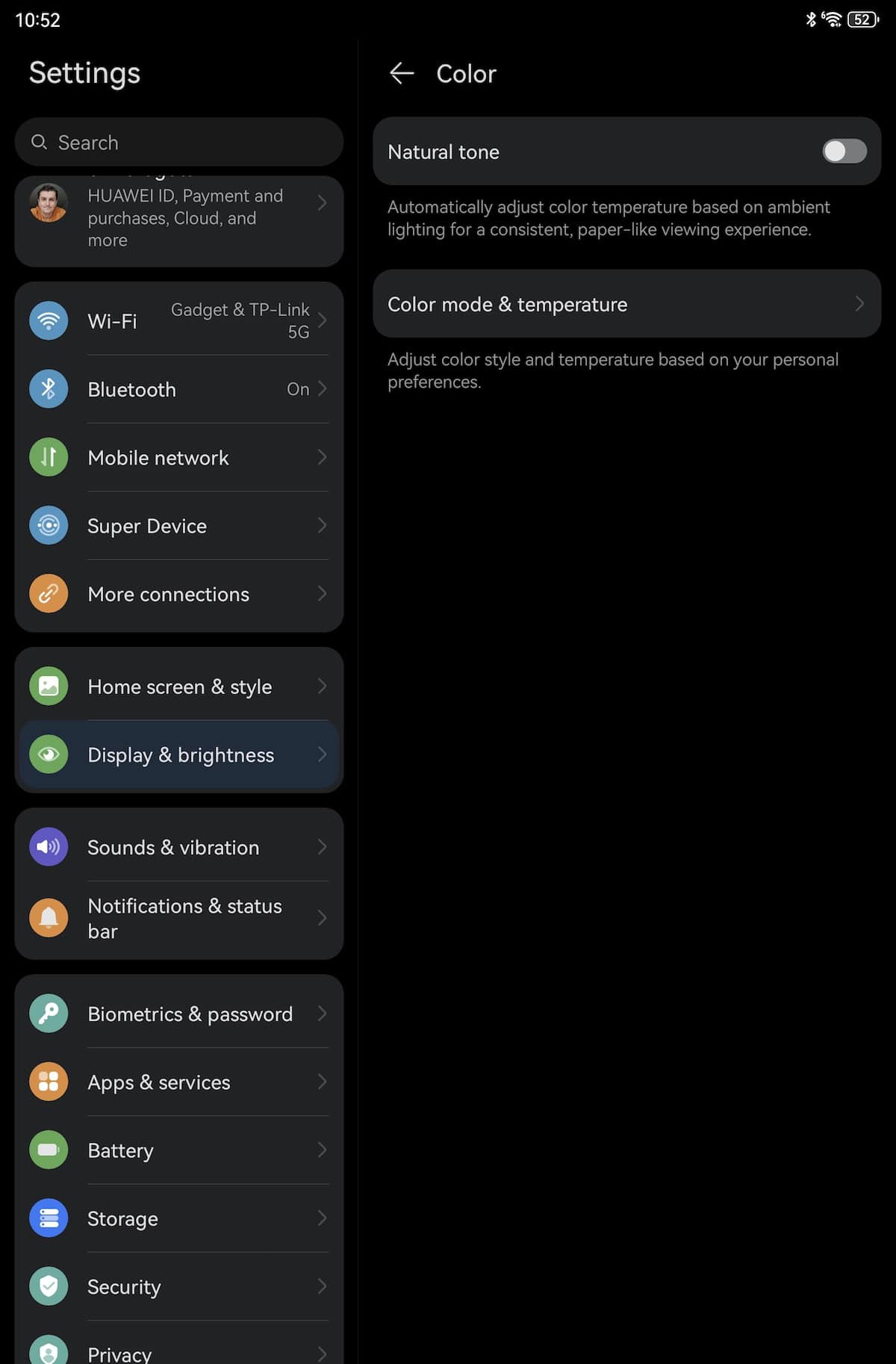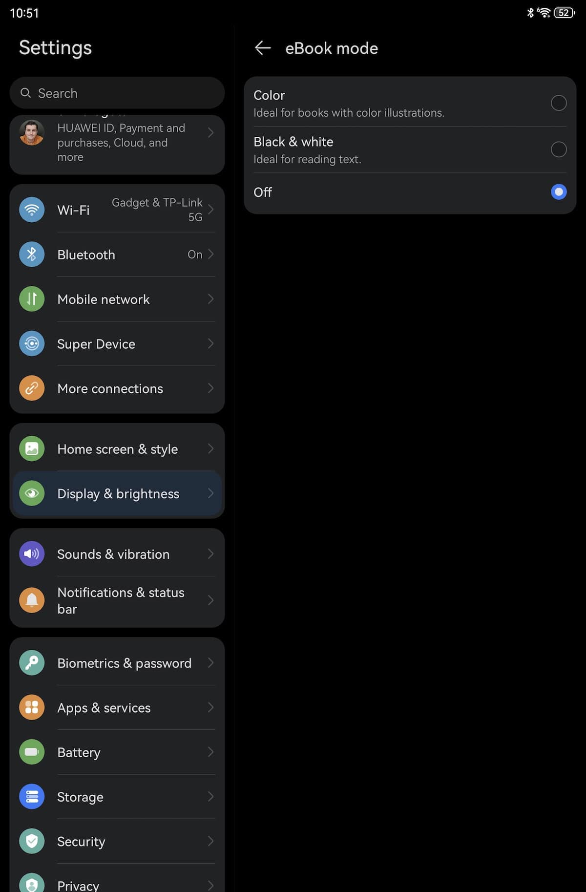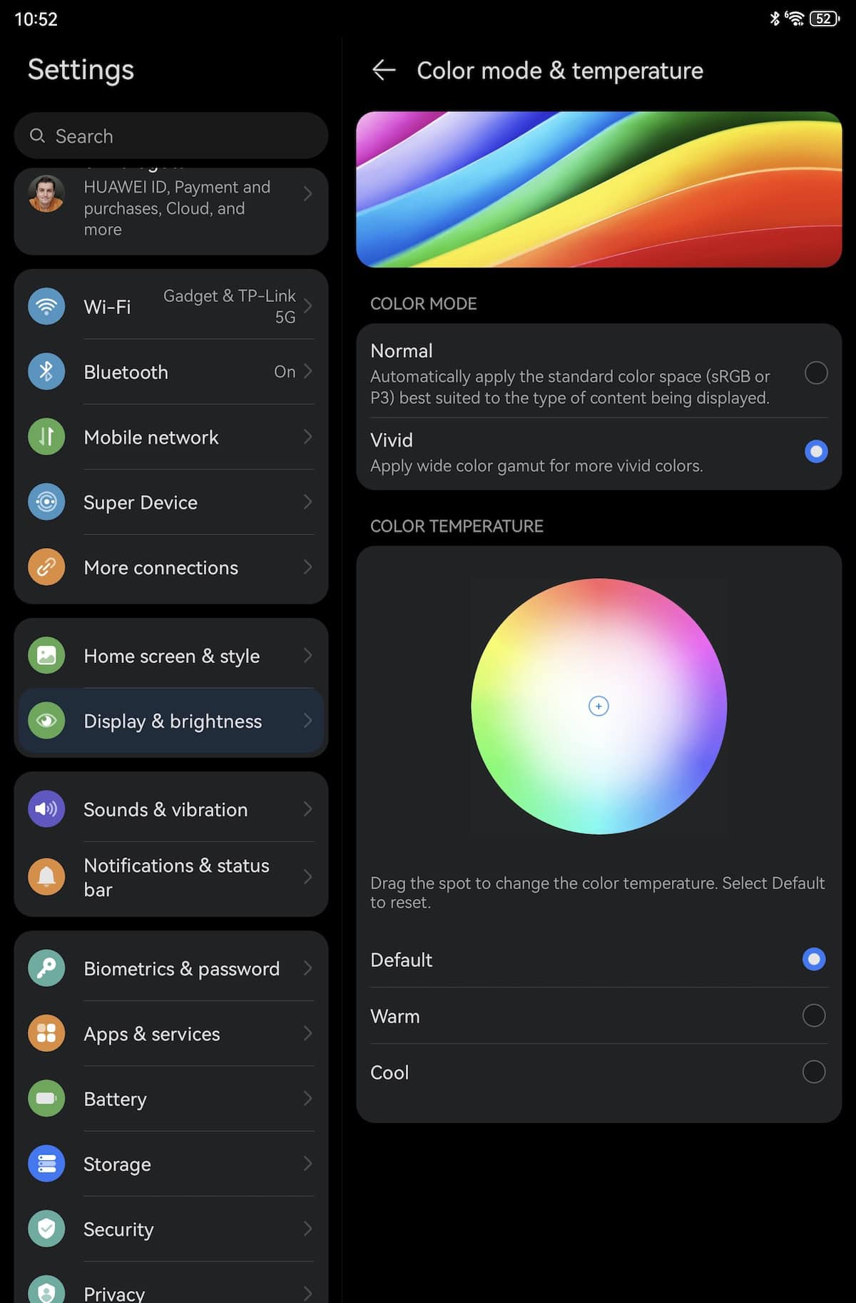 Când am citit că este un panel TFT, am crezut că experiența de vizionare nu este cine știe, dar pe lângă tehnologia PaperMatte ce nu reflectă spațiul ambiant și feedback-ul bun dat, aș nota și culorile ce arată neașteptat de bine pentru astfel de panel. Sunt două moduri: Normal și poți alege între spectrul sRGB și DCI-P3 și Vivid. Are certificare HDR Vivid și am folosit tableta pe al doilea mod, boost-ul de culoare este sesizabil, dar fără să deranjeze.