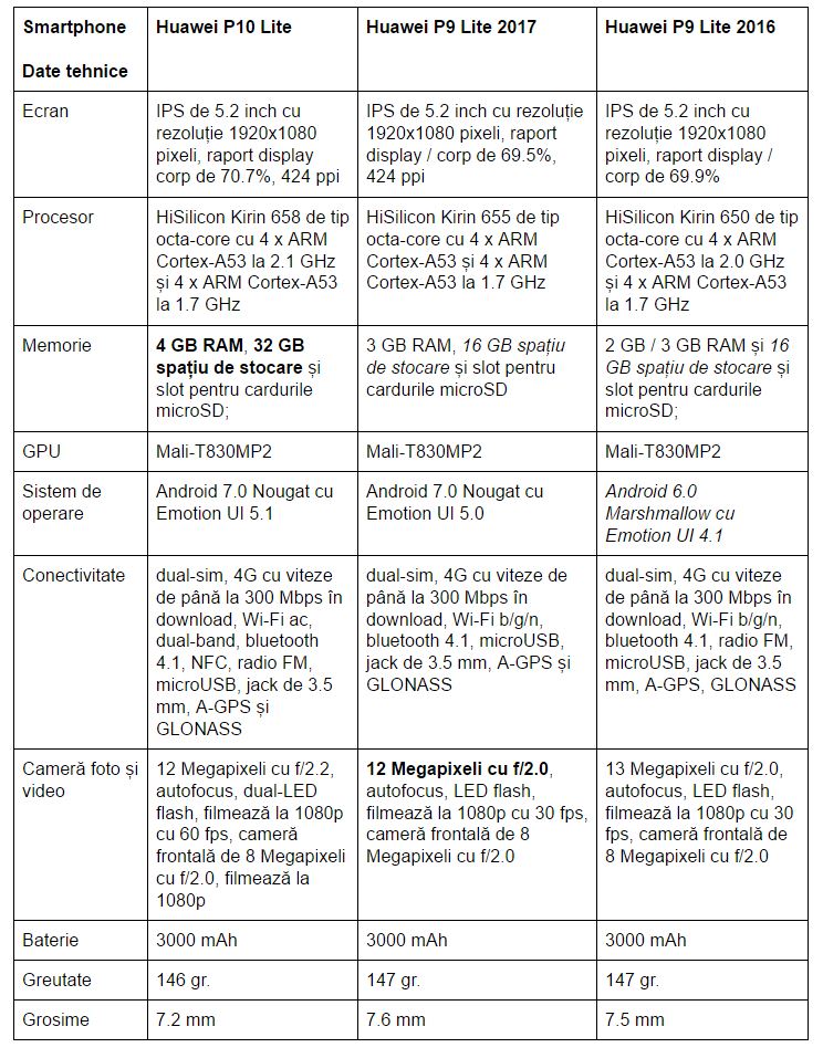 Mai jos puteți vedea care sunt specificațiile lui Huawei P10 Lite, P9 Lite în edițiile pe 2017 și 2016. Orange îl aduce fix în ediția prezentată în tabel: 3 GB RAM și 16 GB stocare. Presupun că-l vom testat și noi în viitorul apropiat, iar acolo veți afla toate detaliile pentru un smartphone mid-range ce dorește a juca puternic în liga best-buy.