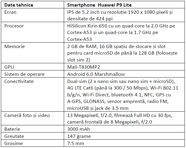 Huawei P9 Lite vine în mai multe variante, în special date de frecvențele pe care le suportă pe benzile GSM. De asemenea există și versiuni cu 3 GB de RAM, dar nu vom vorbi despre celelalte, ci despre modelul VNS-L21, ca cel primit de noi la test.