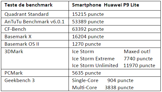 Rezultatele testelor de benchmark pe care le-a susținut Huawei P9 Lite sunt trecute în tabelul următor: