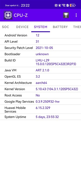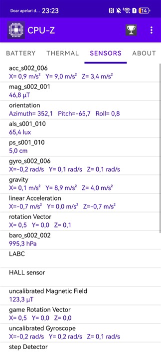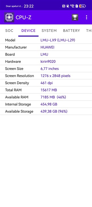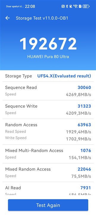 Memorie RAM este din plin, avem 16 GB reali, deci nu cu memorie preluată din spațiul de stocare, care este de 512 GB. De fapt, doar o astfel de versiune este disponibilă la vânzare în țara noastră pentru Huawei Pura 80 Ultra – 16 + 512 GB. Merită precizat că spațiul de stocare este dintre cele mai rapide la ora actuală din ce se poate monta pe un smartphone, cu viteze foarte ridicate, pe care le puteți descoperi la capitolul următor, din testul de benchmark dedicat.