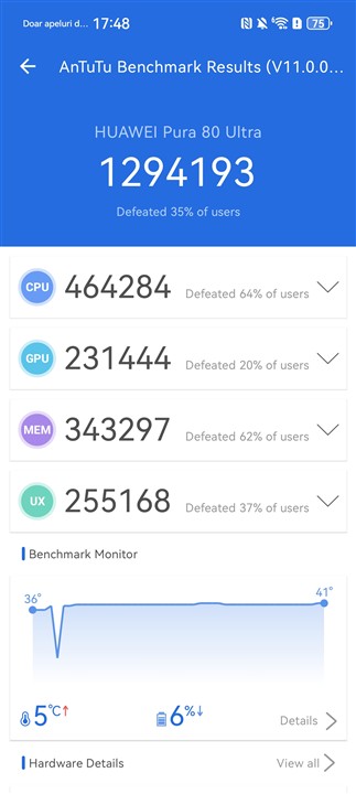 🔺Cu aproape 1.3 milioane puncte în AnTuTu, Pura 80 Ultra nu se poate întrece de la egal la egal cu alte flagship-uri actuale, dar depășește generația de anul trecut cu peste 400.000 de puncte.