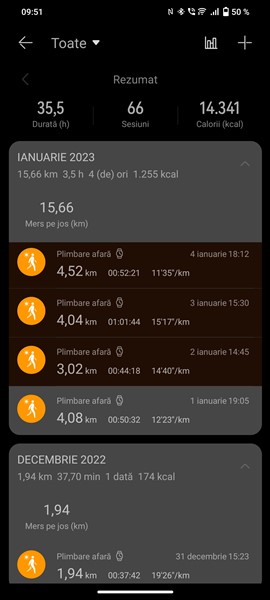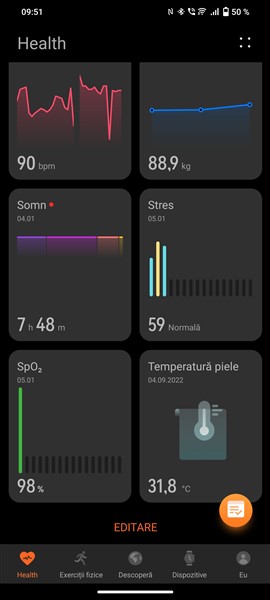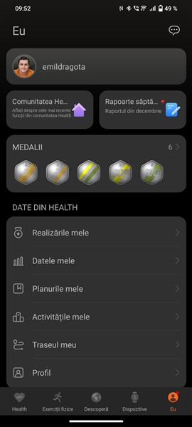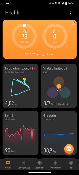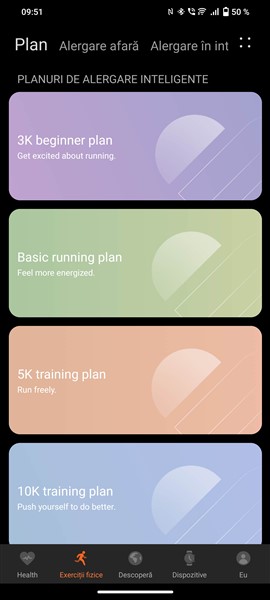 Huawei Health este o aplicație bine pusă la punct și cu multe opțiuni. Ecranul de start oferă informații legate de distanța parcursă și minutele de activitate, dar aici sunt scurtături și spre exercițiile înregistrate, ritmul cardiac, greutate (utilizatorul actualizează greutatea), somn, stres etc. Secțiunea Exerciții fizice oferă o sumă de planuri pe care le poți activa și de care poți încerca să te ții spre a îmbunătăți condiția fizică.