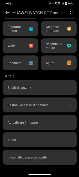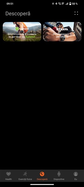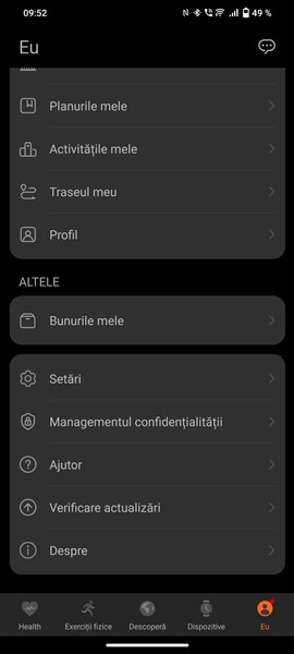 Descoperă te duce spre sincronizarea cu Komoot și Strava. Dispozitive îți aduce informații legate de ceasul conectat, acces spre galeria de aplicații, fațete de ceas. Eu este ultima secțiune din aplicații și aici introduci date persoanel (înălțime etc), dar poți să verifici și ce actualizări sunt etc.