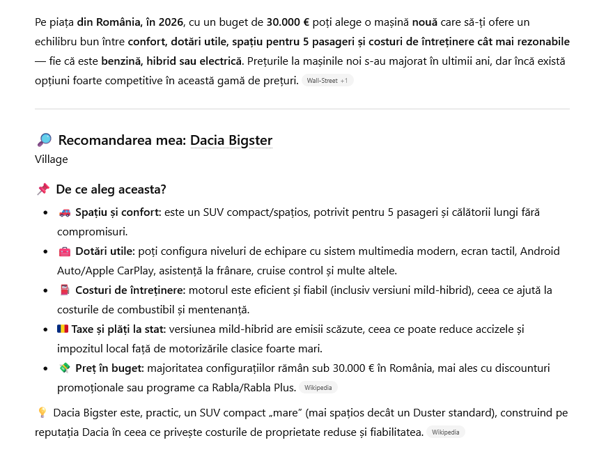 ChatGPT a mers pe mâna modelului autohton Dacia Bigster. A ales această maşină pentru spaţiu şi confort, dotări mai puţine, dar esenţiale, costuri de întreţinere reduse şi taxe mai mici la stat.