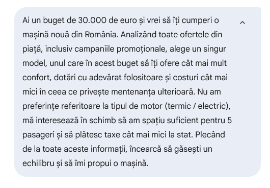 „Ai un buget de 30.000 de euro şi vrei să îţi cumperi o maşină nouă din România. Analizând toate ofertele din piaţă, inclusiv campaniile promoţionale, alege un singur model, unul care în acest buget să îţi ofere cât mai mult confort, dotări cu adevărat folositoare şi costuri cât mai mici în ceea ce priveşte mentenanţa ulterioară. Nu am preferinţe referitoare la tipul de motor (termic / electric), mă interesează în schimb să am spaţiu suficient pentru 5 pasageri şi să plătesc taxe cât mai mici la stat. Plecând de la toate aceste informaţii, încearcă să găseşti un echilibru şi să îmi propui o maşină.”
