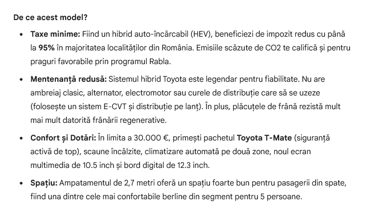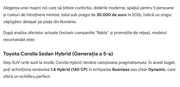 Google Gemini a fost mult mai exact în răspuns şi a reuşit să gândească ceva mai profund decât ChatGPT. AI-ul celor de la Google îmi recomandă Toyota Corolla Sedan Hybrid, versiunea 1.8 Hybrid de 140 CP, în echiparea Business sau chiar Dynamic.
