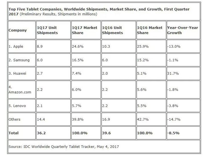 IDC a venit cu statistică detaliată pentru piața de tablete în primul trimestru din 2017. Piața s-a comprimat față de aceeași perioadă din 2016, cu 3.4 milioane unități mai puțin.
