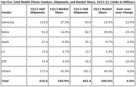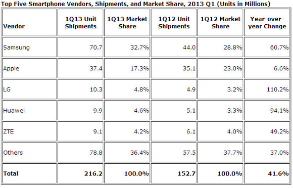 IDC: Statistica vânzărilor de smartphone-uri în primul sfert din 2013