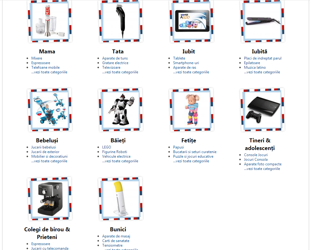 Sugestiile sunt grupate pe 10 categorii, în funcție de destinatarul cadoului – mama, tata, iubit, iubită, bebeluși, băieți, fetițe, tineri & adolescenți, colegi de birou & prieteni și bunici. Odată ce ați selectat categoria dorită, puteți alege ce fel de produs doriți să îi cumpărați – telefon, aparat foto, tabletă, ebook Reader, etc.
