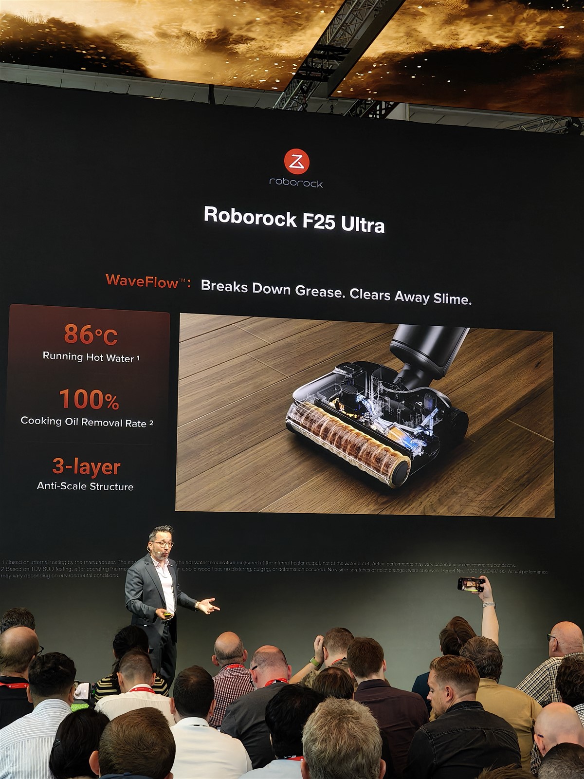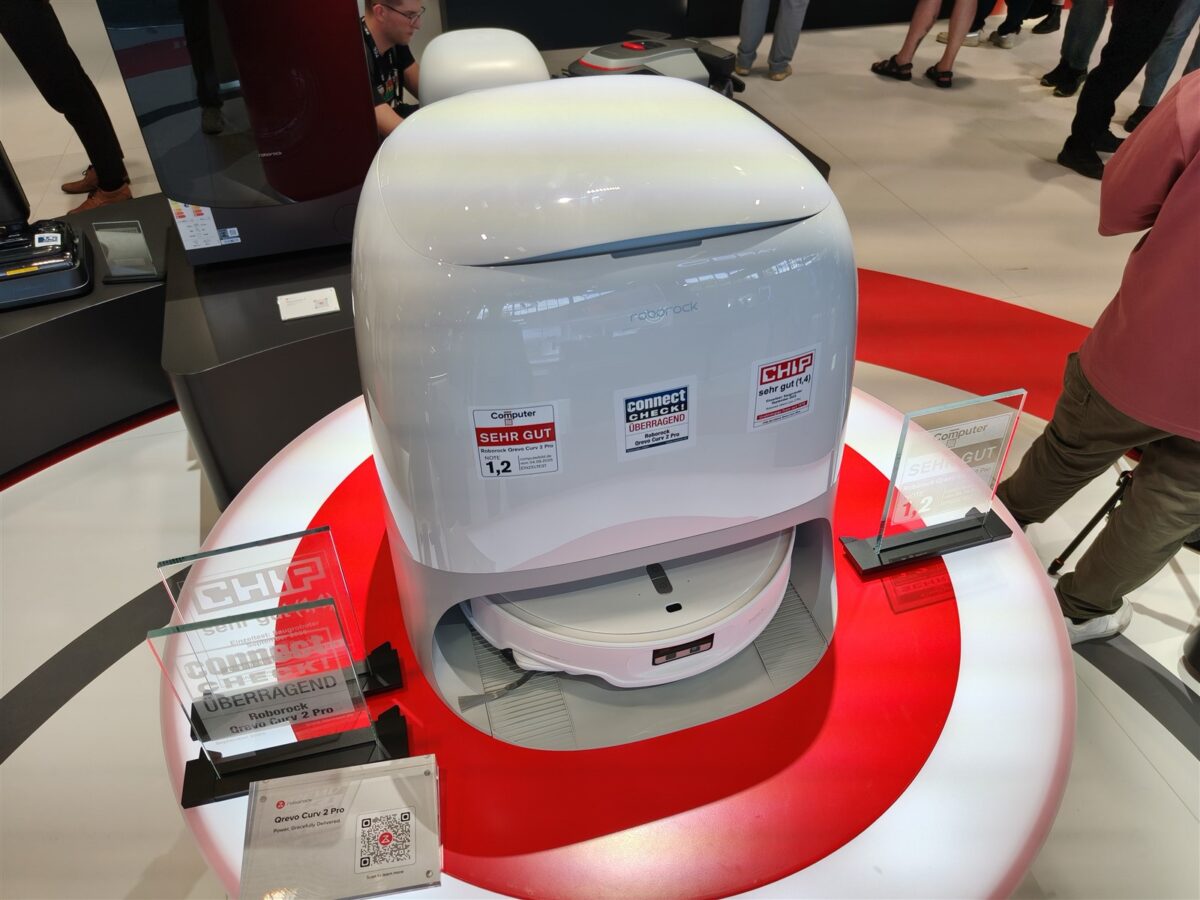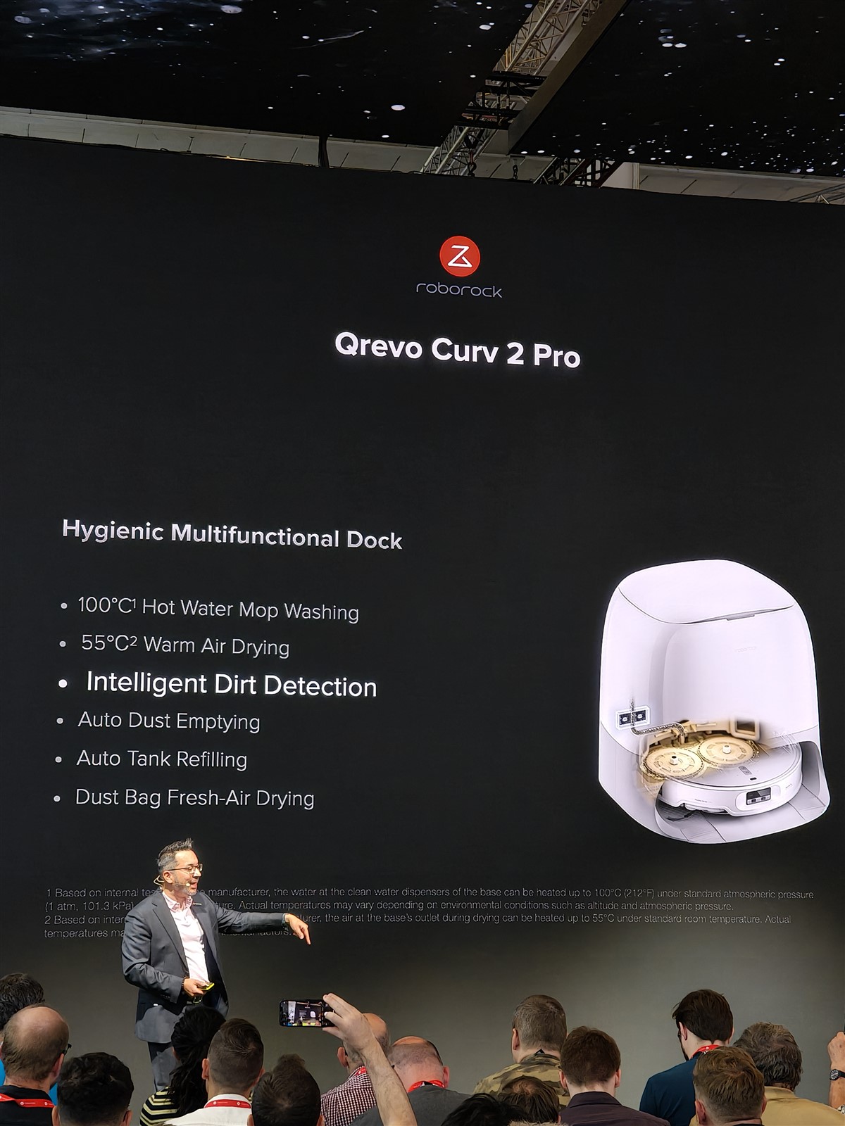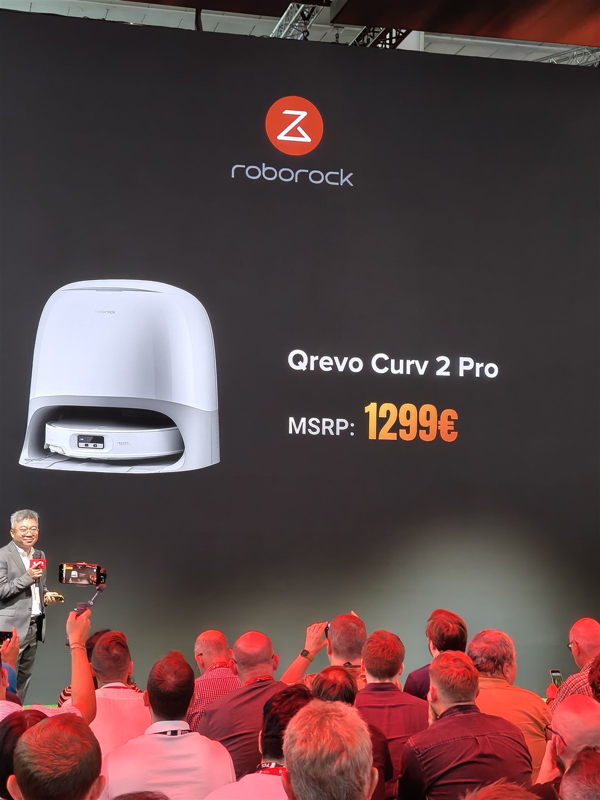 Aici, Roborock a scos în evidență modelul de top Qrevo Curv 2 Pro, care este un aspirator robot cu o putere de aspirare de 25.000 Pa și o înălțime de 7.98 cm, posibilă datorită sistemului de navigație LiDAR retractabil (RetractSense), care îi permite să curețe sub mobilier jos. Modelul dispune de un șasiu AdaptiLift îmbunătățit pentru adaptarea la covoare și poate depăși praguri de până la 3 cm. Sistemul său de curățare include mopuri duble rotative și tehnologia FlexiArm pentru peria laterală și mop, asigurând o acoperire extinsă a marginilor și colțurilor. Stația de andocare multifuncțională 3.0 realizează spălarea mopurilor și autocurățarea bazei cu apă încălzită la 100°C pentru igienizare, usucă mopurile cu aer cald și goleşte automat recipientul de praf al robotului. De asemenea, robotul este echipat cu un sistem de recunoaștere a obstacolelor bazat pe inteligență artificială și lumină structurată, un asistent vocal integrat și funcție de comunicare video.