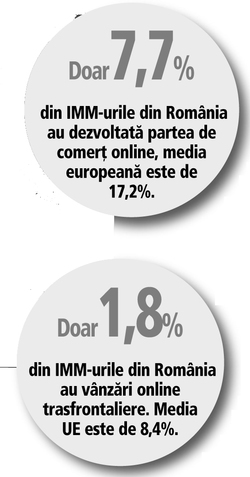 - doar 7.7% dintre IMM-uri îşi vând produsele / serviciile online (locul 27 în Uniunea Europeană);
