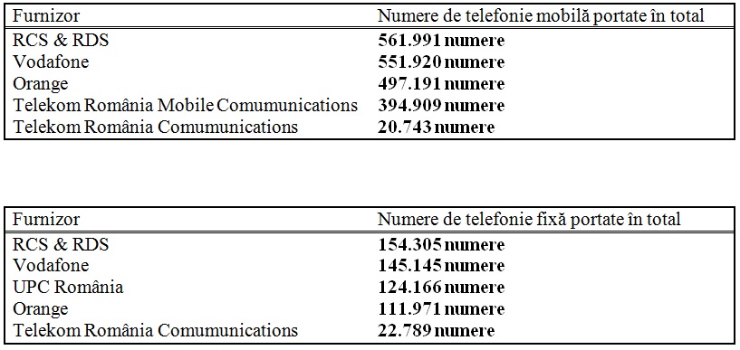 Din totalul numerelor portate până la sfârşitul anului trecut, tot RCS & RDS deţine prima poziţie atât pentru reţeaua mobilă de telefonie (561.991 numere), cât şi pentru cea fixă (154.305 numere). Mai multe detalii puteţi găsi pe ancom.org.ro.