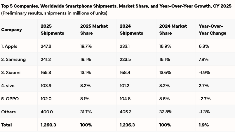Conform raportului IDC pentru 2025, în toată lumea au fost livrate 1.26 miliarde de smartphone-uri, în creştere cu 1.9% vs 2024. Pe o piaţă extrem de competitivă şi agresivă, Apple şi Samsung au continuat să facă legea, cele două companii având şi cele mai mari creşteri an pe an: