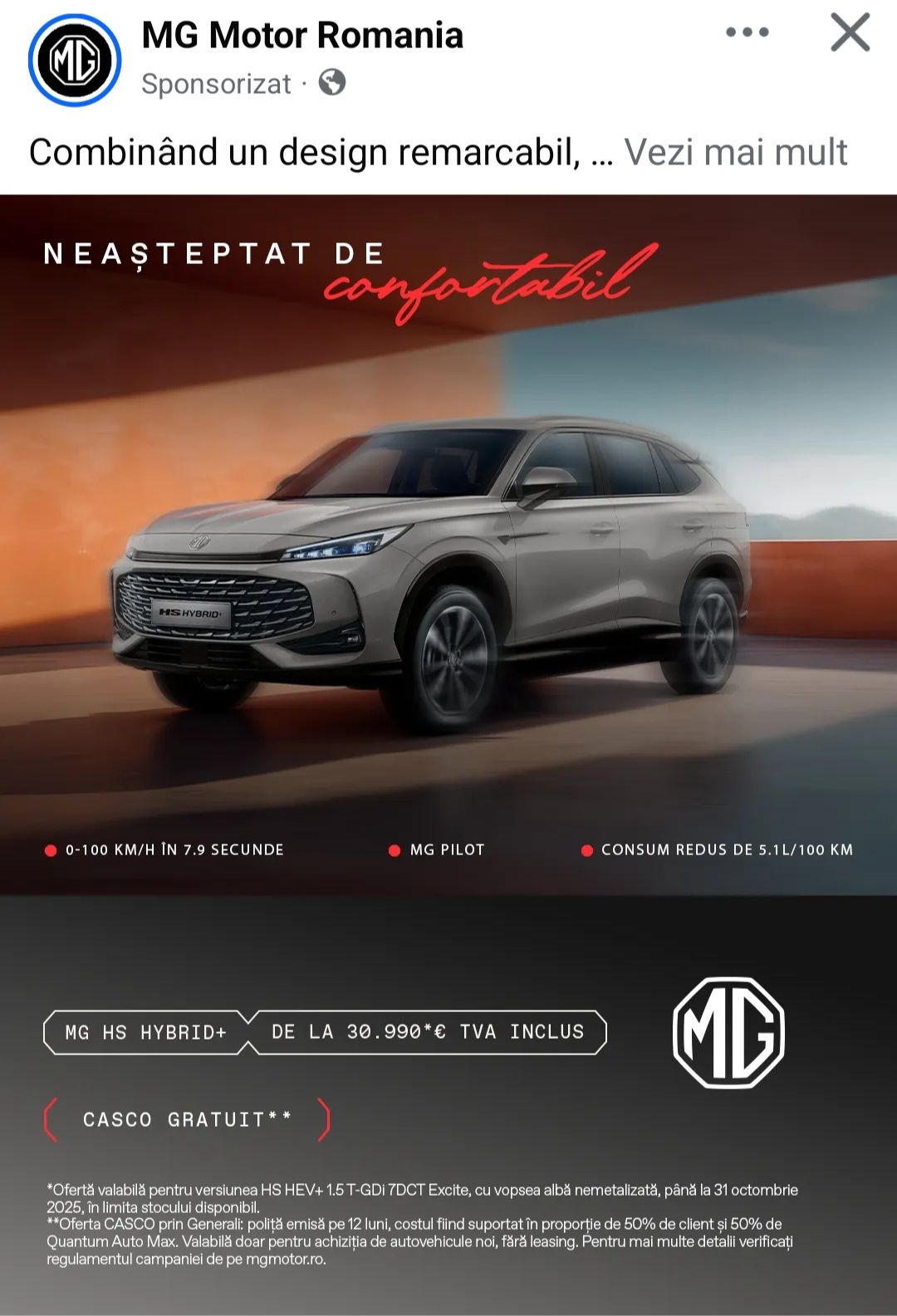 Recent am descoperit pe Facebook o nouă ofertă promoţională din partea celor de la MG. Aceştia îşi promovează noul MG HS 2 Hybrid+, unul cu un preţ de plecare bun de 30.990 euro TVA inclus.