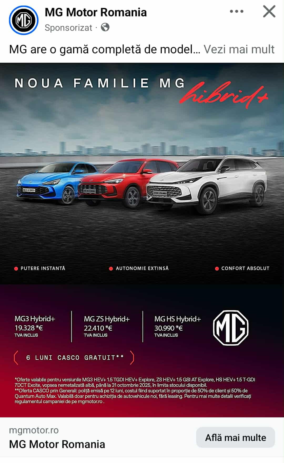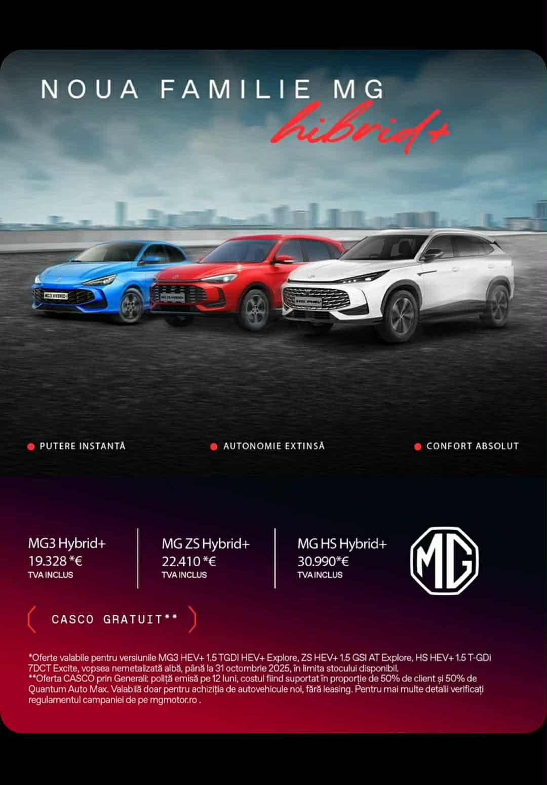 PS 2: Aşa zisa ofertă cu CASCO GRATUIT se aplică şi pentru MG3 Hybrid+ şi MG ZS Hybrid+. Practic toată gama Hybrid+ primeşte CASCO GRATUIT pentru 12 luni, dacă plăteşte şi clientul 50% din valoarea sa 🤣.
