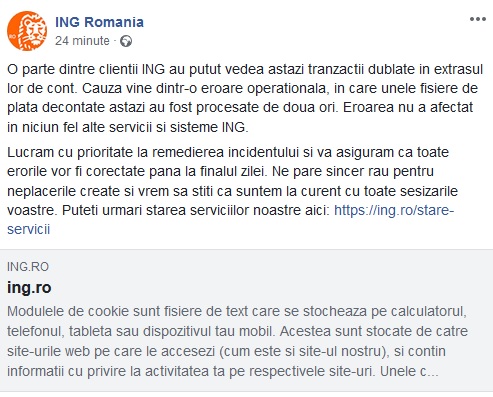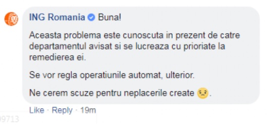 În social media plângerile curg pe bandă rulantă şi chiar dacă situaţia a fost preluată de mai toată presa din ţară, ING România nu a dat niciun comunicat oficial pentru a explica cele întâmplate, limitându-se în a răspunde punctual utlizatorilor pe pagina de Facebook: