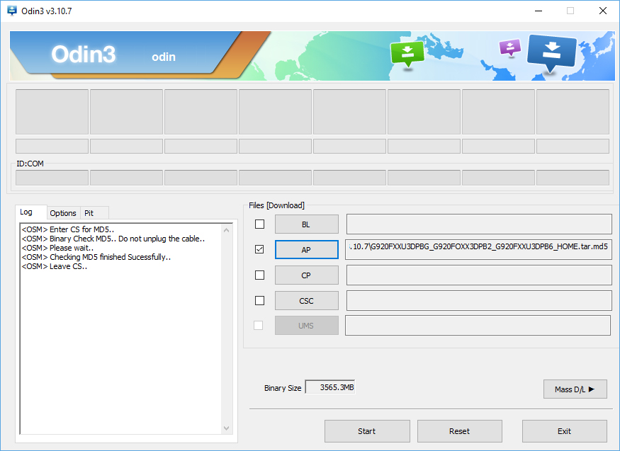 4. În Odin3 apasă butonul AP și selectează fișierul firmware cu extensia .tar.md5 astfel încât fereastra ta Odin să semene cu cea din imaginea de mai jos.