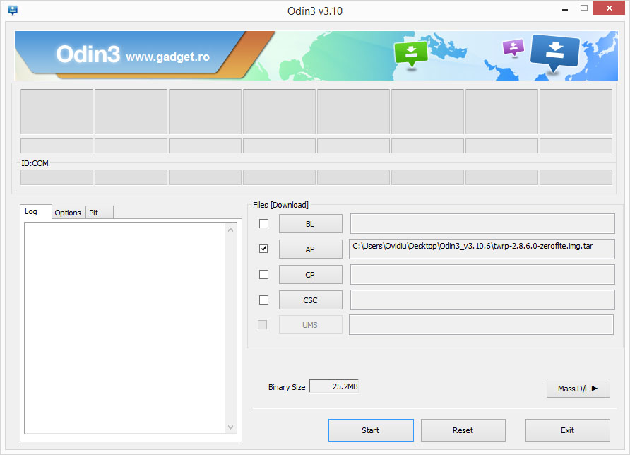 4. În Odin, apasă butonul AP (sau PDA în caz că folosești altă versiune Odin) și selectează fișierul TWRP IMG.TAR din același folder, și anume twrp-2.8.6.0-zeroflte.img.tar astfel încât fereastra ta Odin să semene cu cea de mai jos.