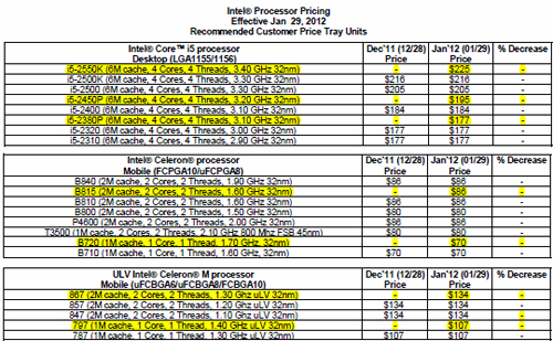 Preţurile noilor model variază de la 225 de dolari pentru Core i5-2550K, până la 70 de dolari pentru Celeron B 720.