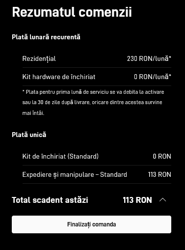 - Rezidenţial – 230 lei / lună (abonamentul standard cu toate facilităţile disponibile).