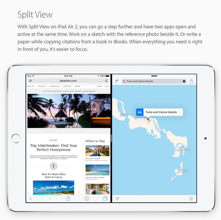 – multitasking prin funcţiile Split View şi Slide Over pe tabletele iPad;