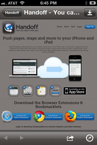 Handoff works by using a web service to connect your desktop browser to your iOS device. Once you have the app installed, all you need to do is download a browser extension or bookmarklet from http://www.handoffapp.com to get started.