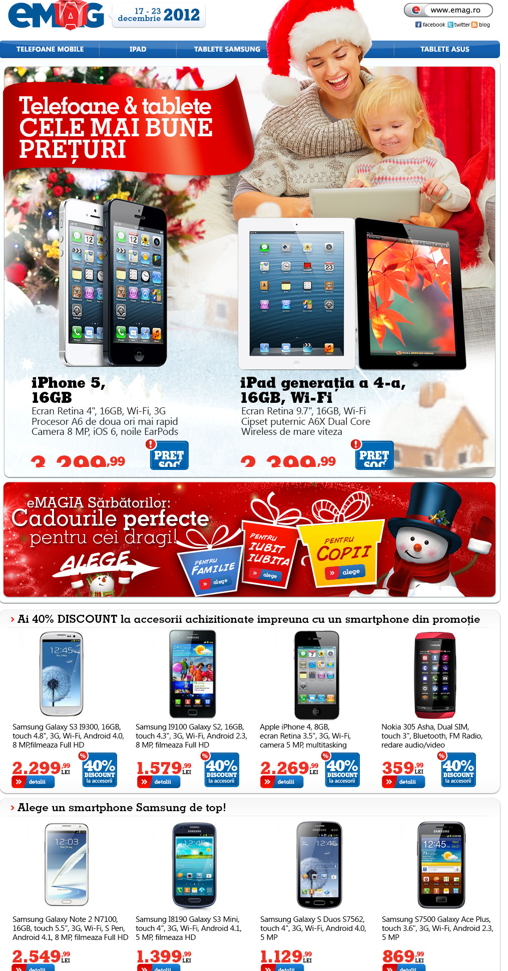 Câte zile mai sunt până la Crăciun? Cei cu familii mari, prieteni numeroși și generozitate din plin știu exact răspunsul la această întrebare, deoarece magazinele sunt îmbulzite cu oameni iar portofelele sunt tot mai goale. eMag vine cu o promoție la telefoane și tablete în perioada 17-23 decembrie 2012, care să vă ajute să faceți un cadou cuiva drag, sau de ce nu, să vă cumpărați ceva frumos pentru dumneavoastră.