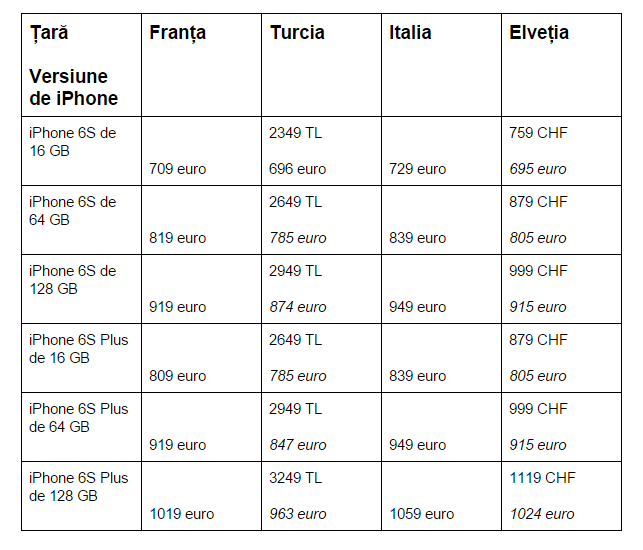 Prețurile practicate pentru iPhone 6S și 6S Plus în Franța, Turcia, Italia și Elveția