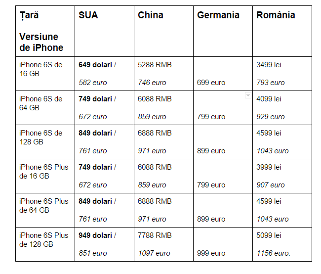 Prețurile practicate pentru iPhone 6S și 6S Plus în SUA, China, Germania și România;