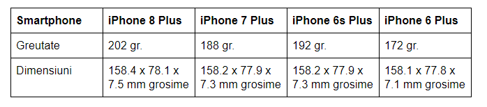Aș spune că avem o evoluție interesantă – nu-i așa? Apple variază greutate și grosimea, de la o generația la alta. Mă rog, modificările sunt relativ mici. Observați că iPhone 8 Plus este cel mai greu și cel mai gros, cu puțin de tot mai lung și mai lat. Cred că husele de iPhone 7 Plus nu se potrivesc la iPhone 8 Plus, dacă contează asta pentru cineva. Prevăd că trecerea la iPhone 8 Plus este realizată mai degrabă de cei ce l-au folosit pe iPhone 6 Plus.