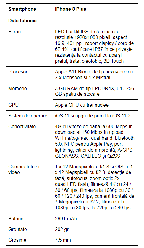 Acum să nu mă înțelegeți greșit. Telefonul este bine fabricat, materiale de bună calitate, atenție la detalii etc. Problema este dată de faptul că arată ușor învechit, iar cei ce trec de asta se aleg cu un iPhone actualizat la nivel hardware, cameră foto etc. Raportul display / corp, chenarul negru abia perceptibil al display-ului sunt elemente ce-l trag în jos pe 8 Plus în bătălia cu iPhone X, iar multe persoane vor dori să plătească în jur de 1000 lei în plus ca să primească un iPhone cu adevărat nou pe partea de design.