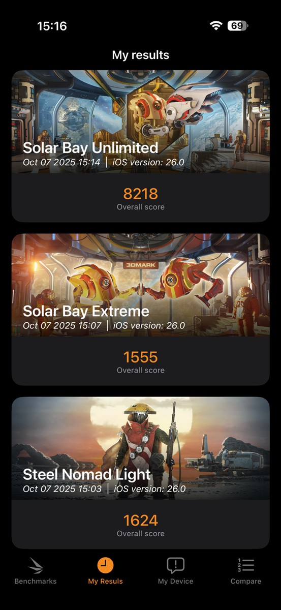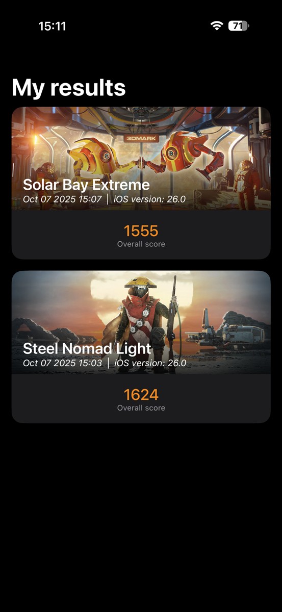 | 3DMark | Solar Bay Unlimited - 8218 puncte; Solar Bay Extreme - 1555 puncte; Steel Nomad Light - 1624 puncte; Wild Life Extreme Unlimited - 3189 puncte |