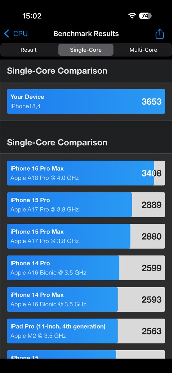 | Procesor | Apple A19 Pro pe 3nm cu 6 nuclee - 2 x 4.26 GHz și 4 nuclee pe partea de eficiență energetică | Qualcomm Snapdragon 8 Elite pe 3nm de tip octa-core, nucleu Oryon V2 Phoenix la 4.47 GHz, 6 x Oryon V2 Phoenix M la 3.53 GHz |