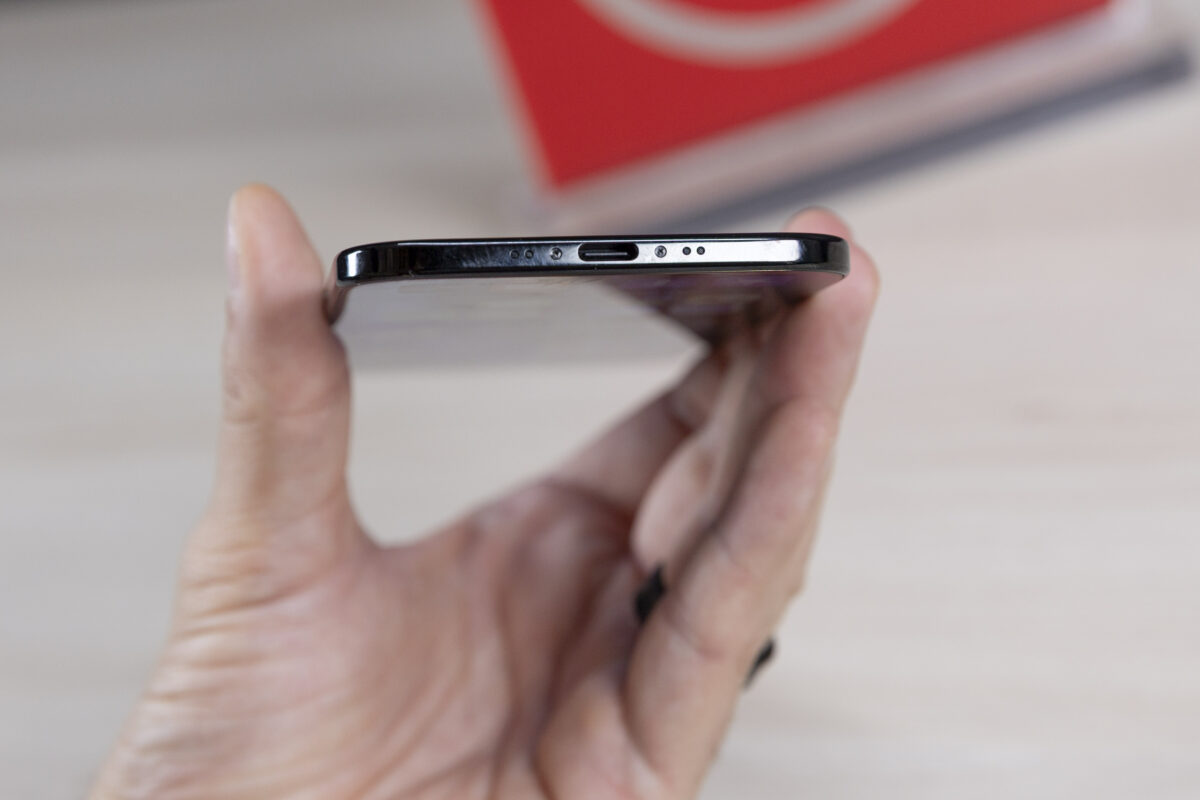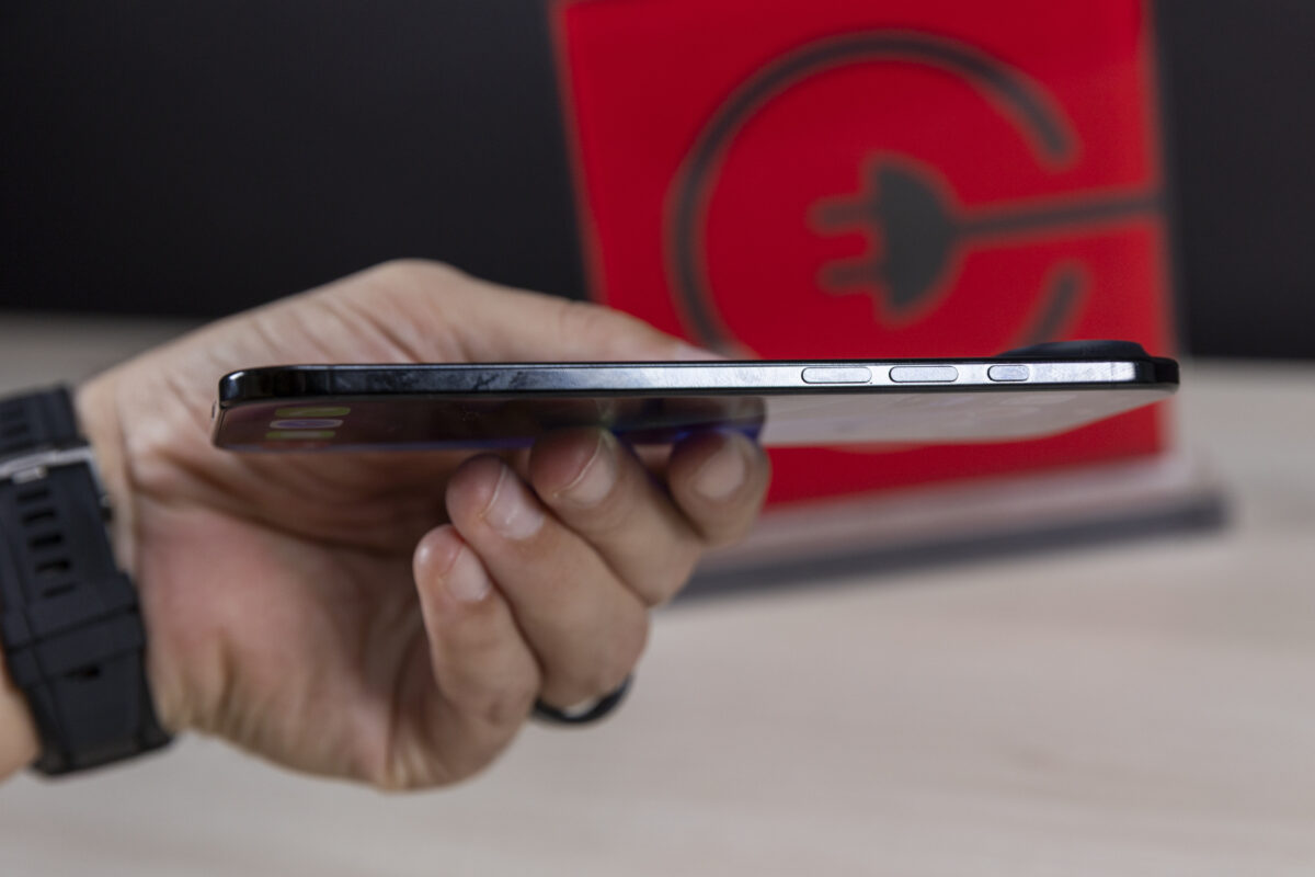 În lateral se află butonul de pornire și cel de activare rapidă a camerei foto și video, la bază dați de portul USB Type-C, iar în lateral stânga se află butonul presetat să facă trecerea între modul silențios și cel normal, dar și tastele pentru reglarea volumului. Lipsește difuzorul de la bază.