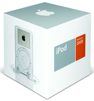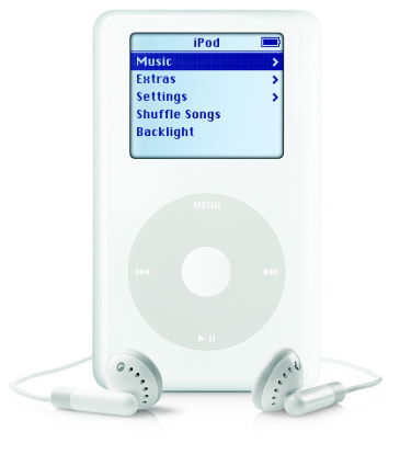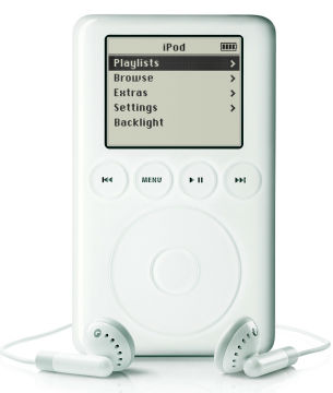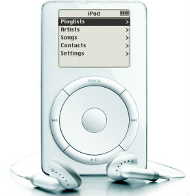 Octombrie 2001 – apare primul iPod lansat cu cele „1000 de piese de buzunar”. Avea capacitate de stocare de 5 GB, cântăreşte 185 de grame, display 160×128, conexiune Fire Wire la preţul de 399 dolari. |
