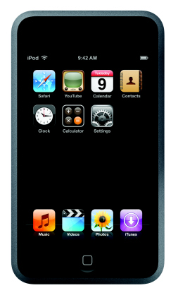 Septembrie 2007 – iPod Touch. După debutul iPhone, Apple lansează iPod Touch care cu aceeaşi interfaţă milti-touch, Wi-Fi încorporat, aplicaţie Youtube şi browser-ul Safari schimbă puţin aşteptările oamenilor de la media-playere. Aplicaţiile Mail, Maps, Stocks, Weather şi Notes au putut fi adăugate doar începând cu ianuarie 2008 prin update. |