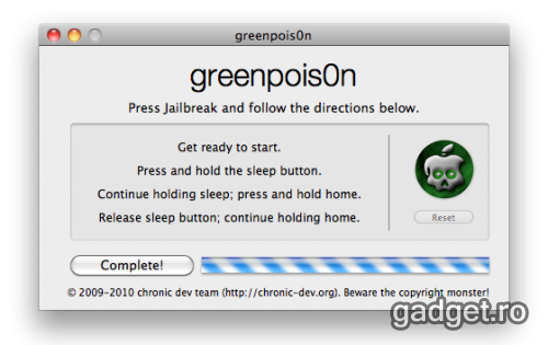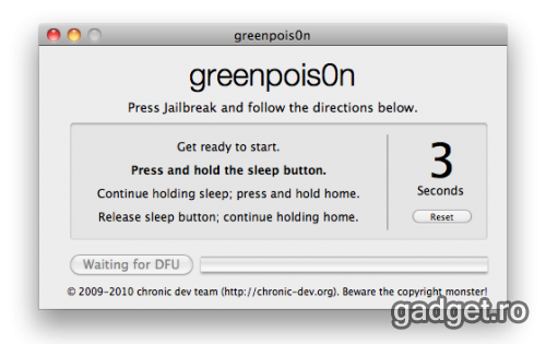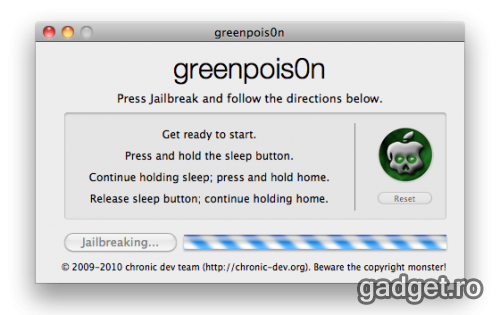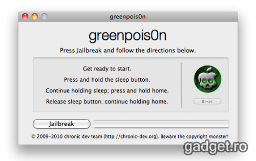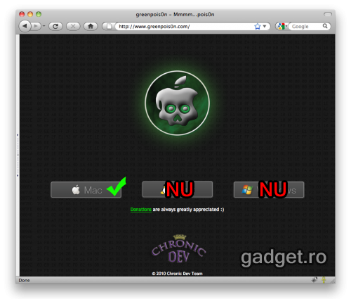 1. Acceseaza site-ul GreenPois0n si descarca varianta pentru Mac (vezi si later edits de la sfarsit, e posibil ca linkurile sa se schimbe!). IMPORTANT: dupa cum am scris si mai sus, utilizatorii de Windows sunt rugati sa ASTEPTE! Versiunile de Windows si Linux publicate pe site-ul greenpois0n in acest moment sunt TETHERED, adica necesita legarea iDevice-ului la PC in momentul fiecarei porniri! Vom publica un tutorial pentru Windows in momentul in care chronic_dev va pune la dispozitie si versiunea pt. Windows. UPDATE: Acceseaza aici si varianta pentru Windows!