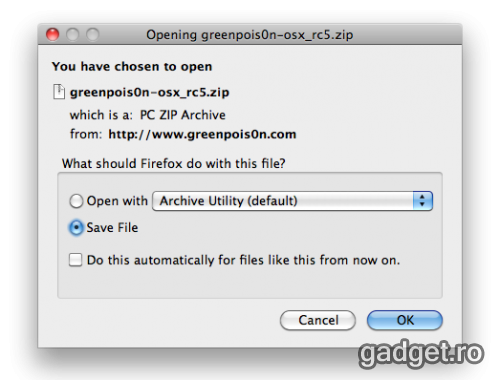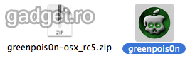 3. Dublu-click pe fisierul descarcat (in cazul exemplului nostru, la aceasta ora, greenpois0n-osx_rc5.zip; e posibil ca numele fisierului sa se schimbe!). Se va extrage un fisier cu icon-ul greenpois0n. Deschide (dublu-click) fisierul „proaspat” extras (greenpois0n).