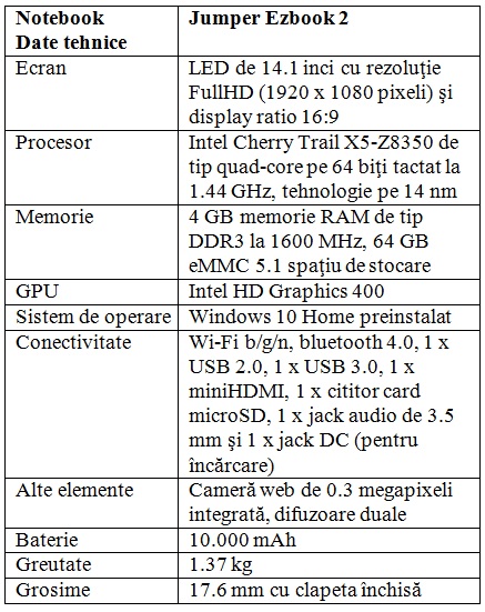 Jumper Ezbook 2 este echipat cu un procesor Intel Cherry Trail X5-Z8350 de tip quad-core pe 64 biţi tactat la 1.44 GHz, tehnologie pe 14 nm, placă grafică integrată Intel HD Graphics 400, 4 GB memorie RAM de tip DDR3 la 1600 MHz şi 64 GB eMMC 5.1 spaţiu de stocare (reali sunt aproximativ 58 GB).
