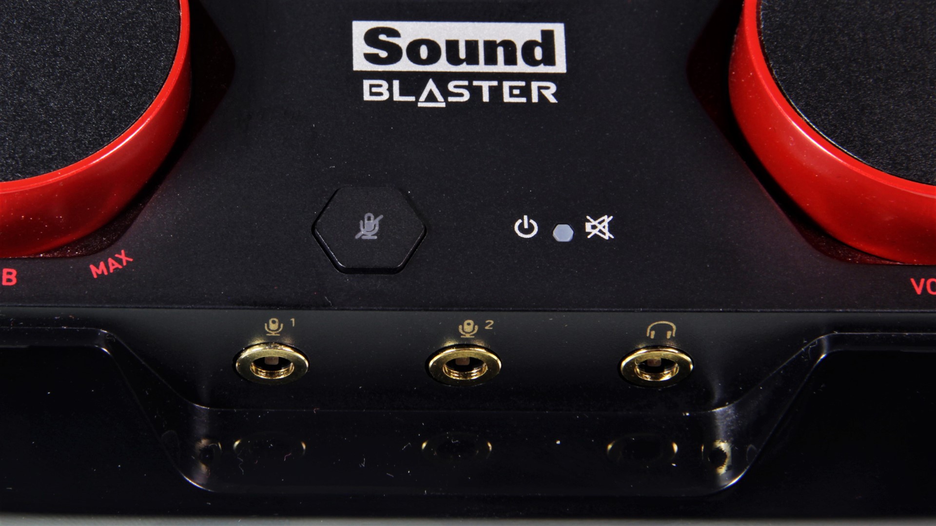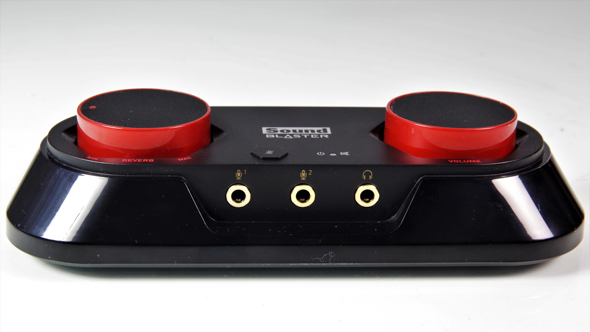Rotițele de control al volumului și reverberației sunt amplasate pe latura de sus, între ele vedem logo-ul Sound Blaster, butonul de anulare a microfoanelor, precum și LED-ul de funcționare.